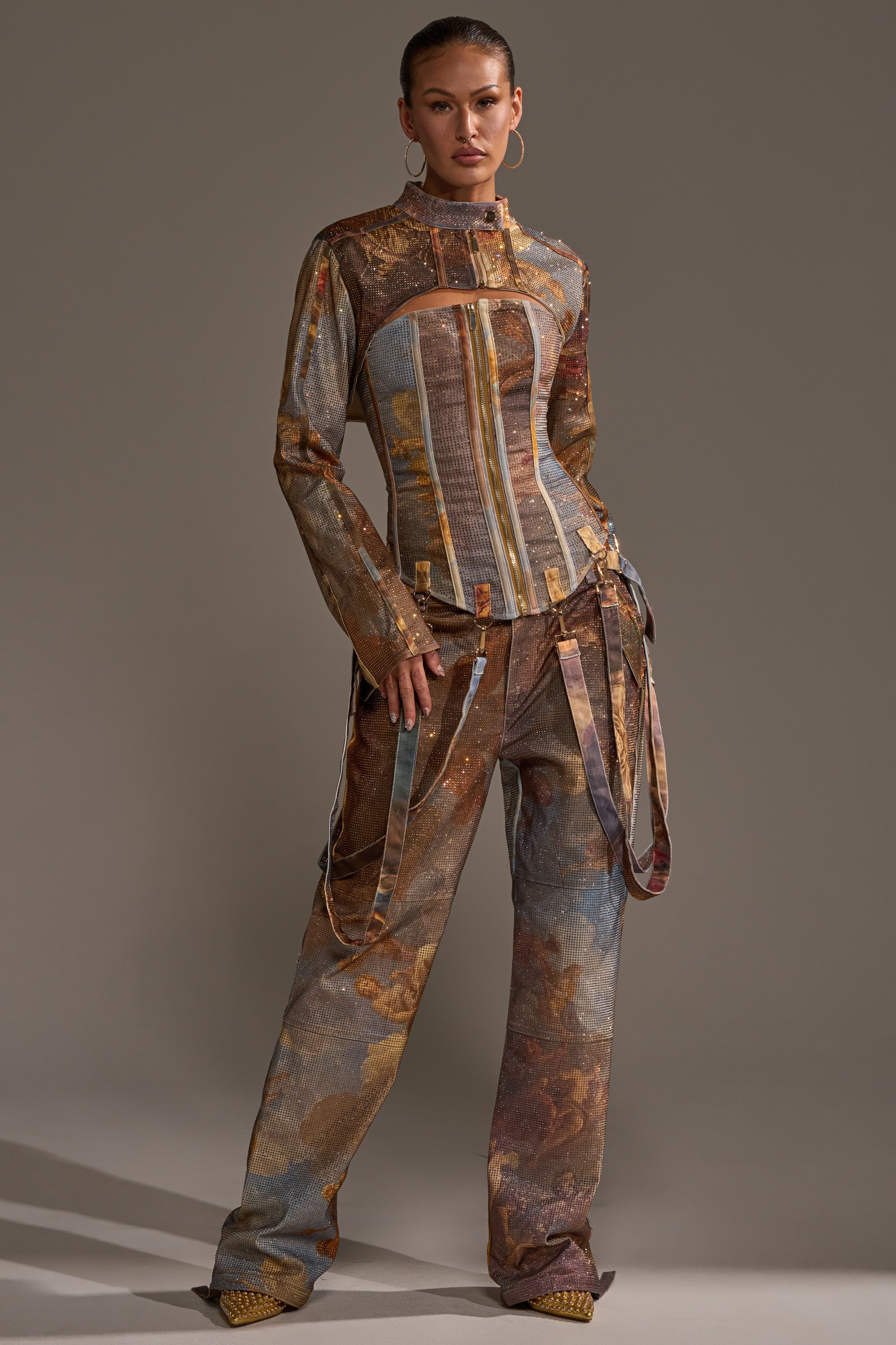 Trend forecast? Matching separates, gorgeous graphics, and sparkles galore. The AKIRA Label In The Future Rhinestone Bolero is crafted from a denim base with an artistic, neo-classical inspired graphic print. It features an ultra-cropped silhouette, a high snap-button collar, and petite, uniform rhinestone embellishments throughout. Complete with gold-tone hardware, silky satin lining, and a zip-front closure. Wear it with the matching In The Future Corset and Trousers for an eye-catching ensemble.