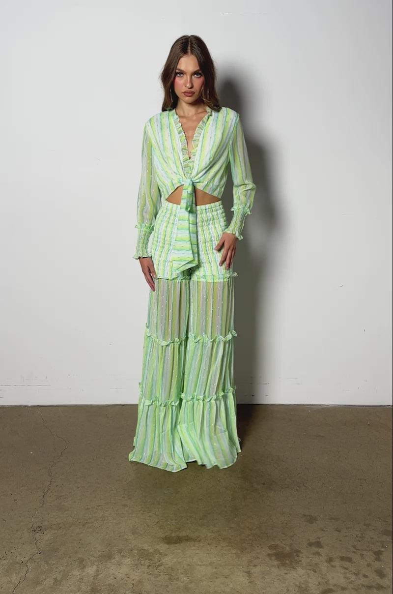 Stay easy and breezy in The AKIRA Label In The Wind Set. This set contains a coordinating top and bottom, which are crafted from a non-stretch, sheer chiffon-inspired fabrication with a bright, striped patterning and metallic detailing. The blouse features a plunging neckline with a tie-front closure, ruffled trim, long sleeves with ruched cuffs, a sleek inner lining in the bust, a pull-on fit, and a cropped length. The pants feature an unlined, high rise design, an extended, elastic ruched waistband, tiered ruffle detailing, a pull-on fit, and a wide leg silhouette. Pair together or separately for an effortlessly windswept ensemble.