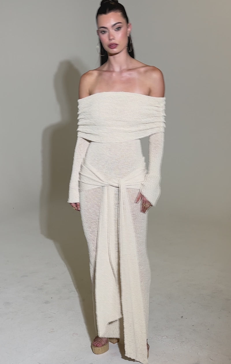Live the fantasy in The AKIRA Label In Your Dreams Knit Maxi Dress. Crafted from a textured, stretchy knit fabric, this off-the-shoulder maxi dress features gracefully draped ruching along the neckline and hips, statement bell sleeves, and a waist tie sash that cascades effortlessly down the front and elongates the figure. Complete with a curve-hugging silhouette and a floor-sweeping hem. Pair with kitten heels and hoop earrings for a sweet, ethereal finish.