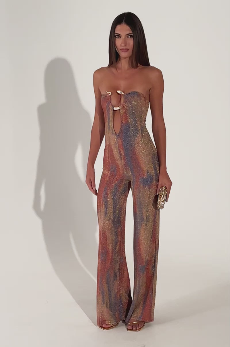 Have your glam moment in The AKIRA Label Izara Printed Jumpsuit With Snake Detail. This glitzy piece is crafted from a super stretchy, lightweight shimmery metallic base and features an abstract multicolor print, a strapless neckline, a teardrop cut out chest detail with a structured faux gold metallic snake hardware accent, a wide leg silhouette, and an easy, pull-on design. Style with pointed stilettos and a metallic clutch for a stunning ensemble.