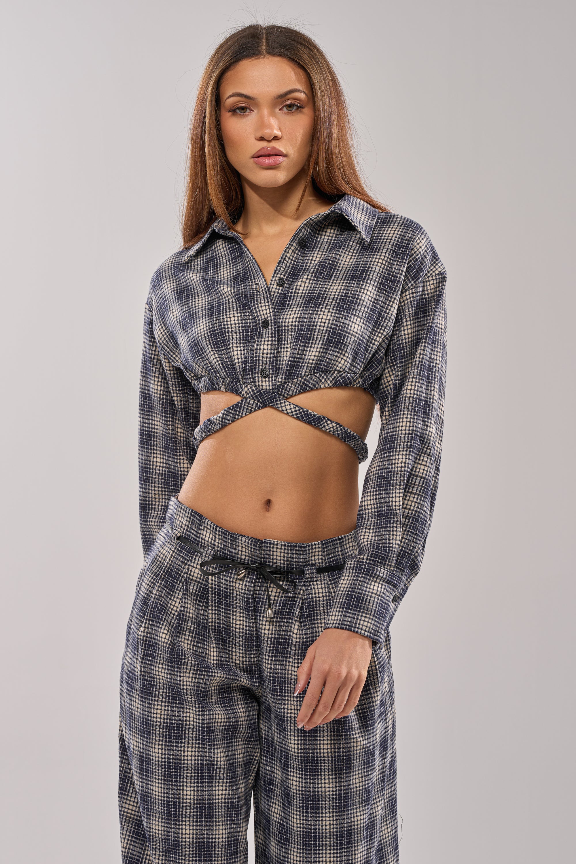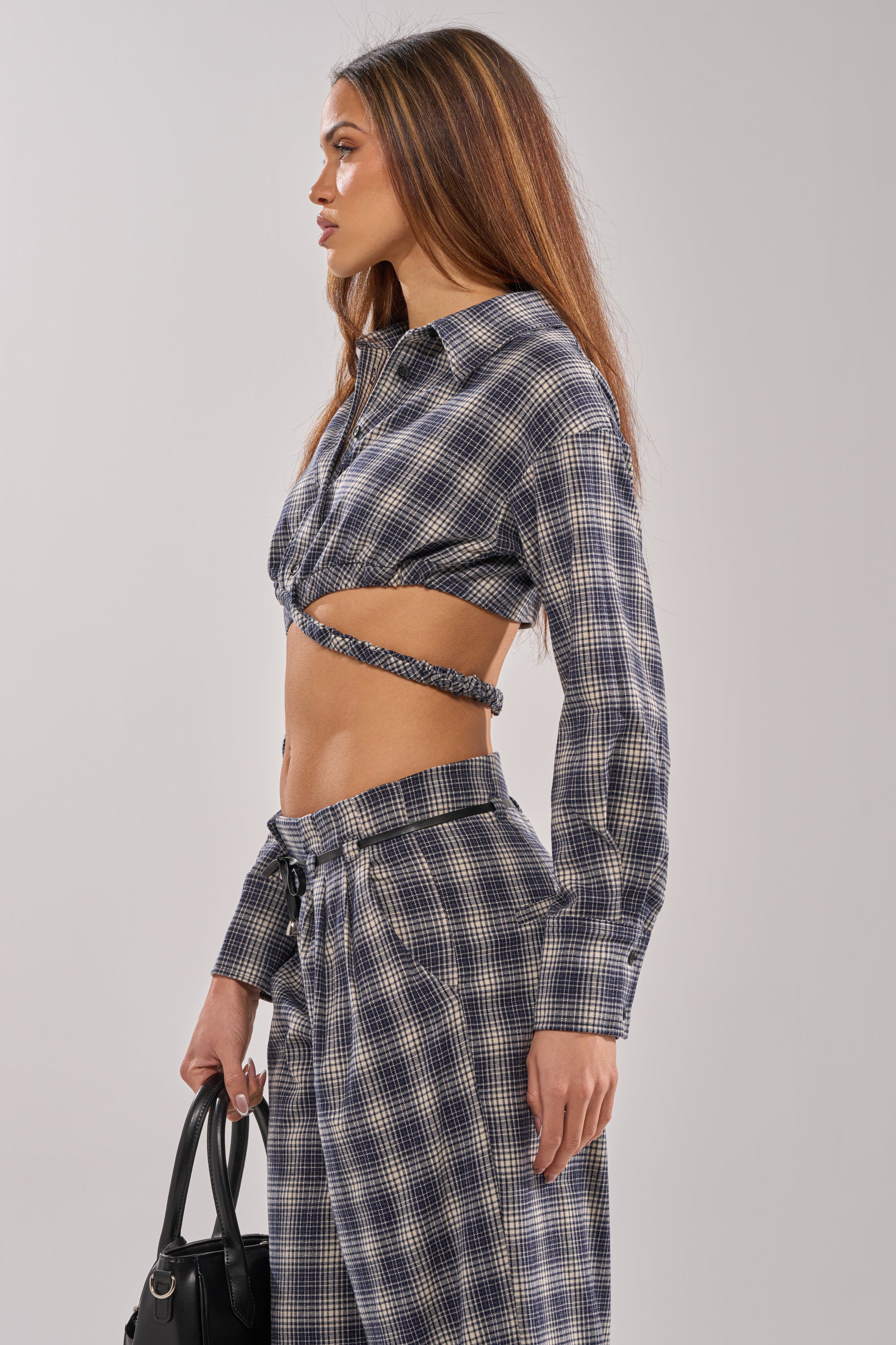Modern cropped plaid button-up top with strap detailing designed for edgy streetwear looks, casual nights out, or trend-forward layering. Crafted from a classic plaid fabric, this long-sleeve shirt features a structured collar, front button closures, and bold waist cutout with wrap-around elastic strap detailing with a clasp enclosure that creates a flattering, sculpted silhouette. The cropped length with an elasticized hem and open-back design add a contemporary twist to a timeless pattern. Style with the coordinating AKIRA Label Jane Plaid Trouser for a classic matching set.