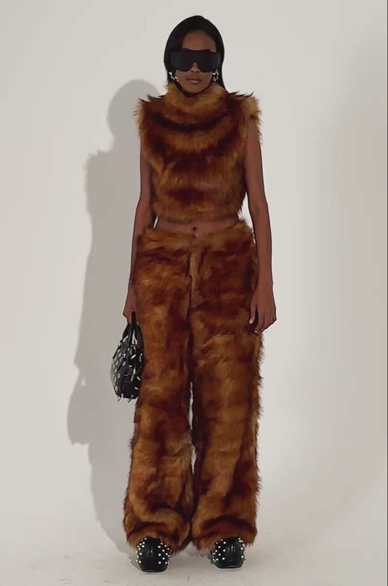 Haters will be furr-ious when they see you rocking The AKIRA Label Jodie Wide Leg Fashion Fur Pant. This editorial trouser is crafted from impossibly soft faux fur and features a relaxed mid-rise fit, a slick satin inner lining, and a concealed side zipper closure. Style with the complementary Wild Child Cropped Fur Vest for a luxe look from head to toe.