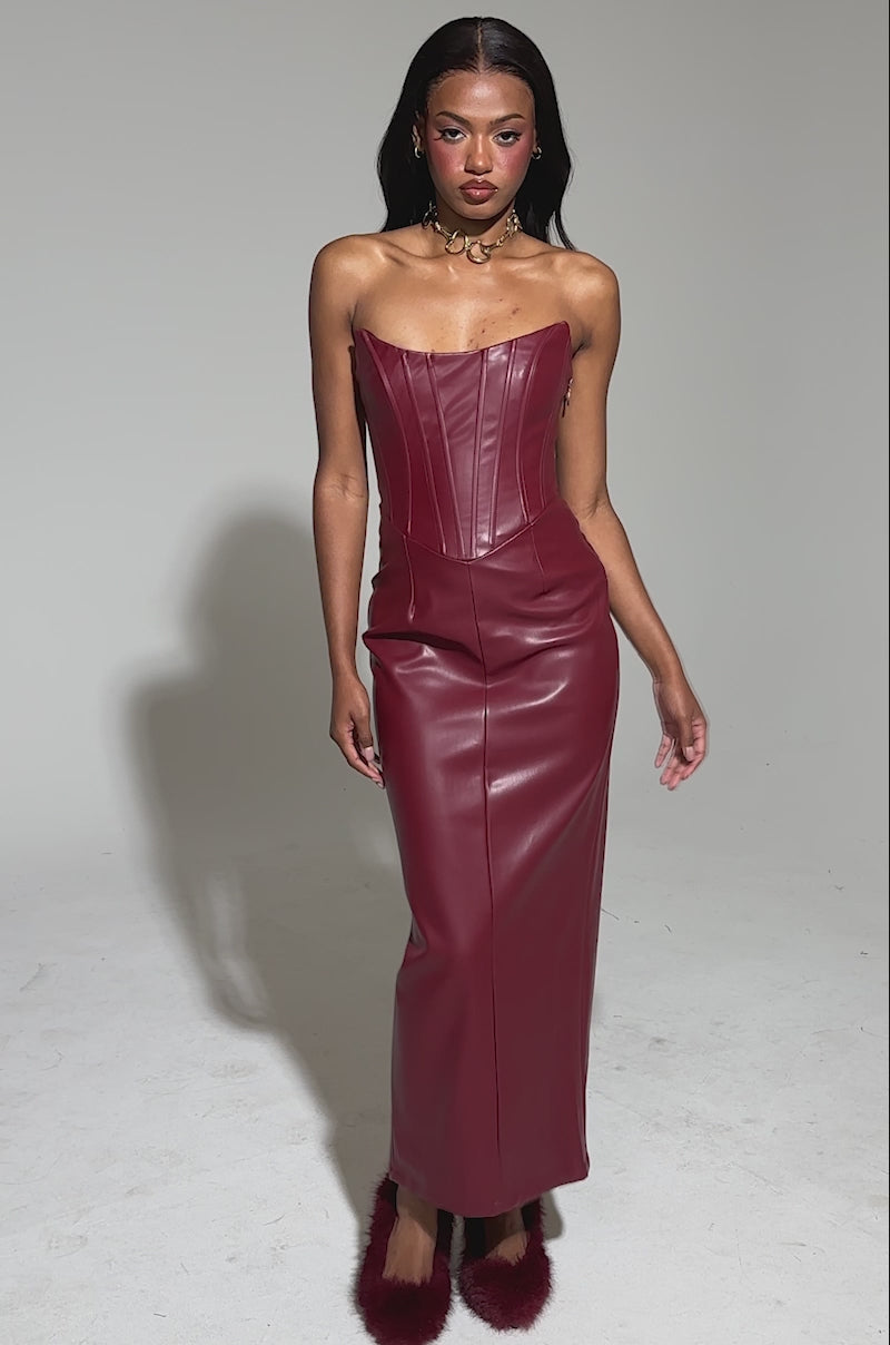 It’s romance at first sign with The AKIRA Label Juliette PU Midi Dress In Burgundy. This sleek bodycon is crafted from supple faux leather and features a sculpted, corset-style bodice with seamed paneling, a pointed strapless neckline with inner elastic trim, a sultry lace-up back panel, a back vent slit, and a concealed side zipper closure. Complete with a midi-length silhouette. Pair with strappy heels and a bold lip for nights out, cocktail parties, or statement eveningwear.