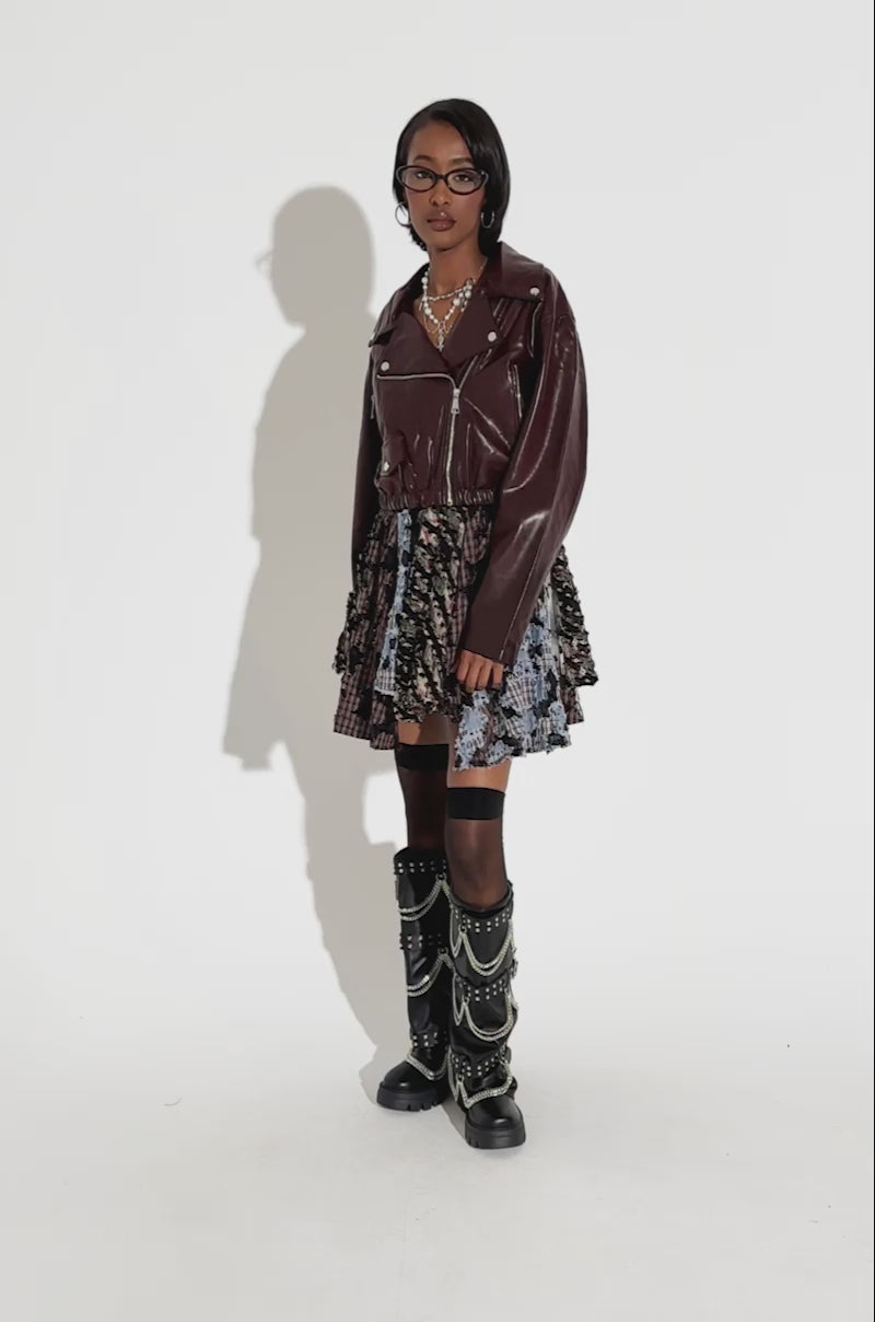 Built for the ride, dressed for the vibe in The AKIRA Label Kali Moto. This hip outerwear jacket is crafted from a rich, supple faux leather fabrication and features a notch lapel collar with faux silver metallic hardware detailing, long sleeves with metallic zippered cuffs, side slant zipper pockets, a mock flap pocket detailing on the bottom hem, an elasticized waistband, and a tonal inner lining. Complete with a coordinating metallic front zipper closure, and a boxy, cropped silhouette. Pair with a pleated mini skirt, lace tights, and knee-high stiletto boots for a sultry finish.