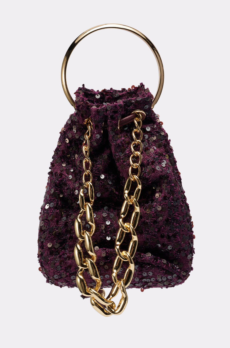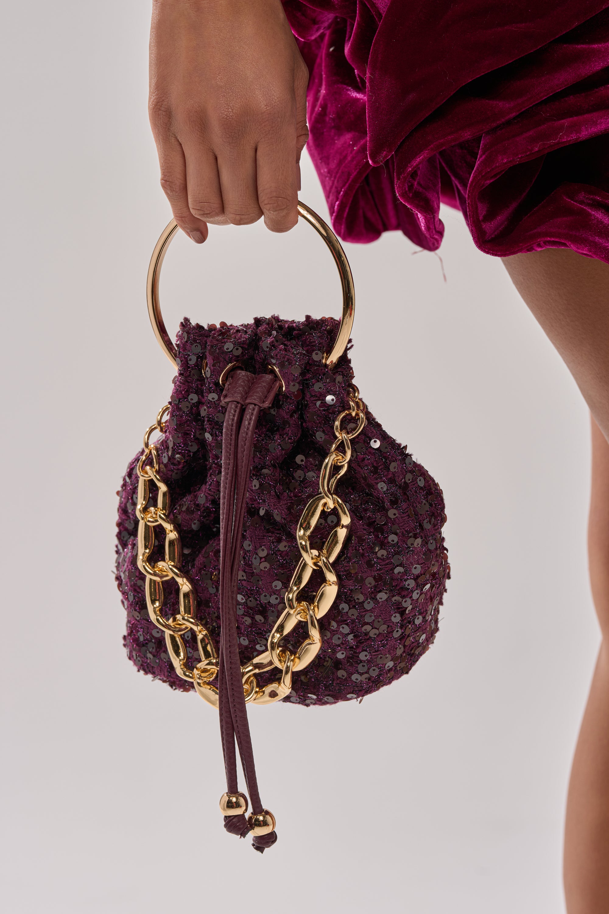The AKIRA Label Kary Tweed Bucket Bag brings classic texture with a touch of modern glamour. Designed in a rich, woven tweed fabric, this mini bucket silhouette features a gold-tone top handle and an oversized chain accent for added luxury. The drawstring closure keeps your essentials secure while maintaining a soft, structured shape. Perfect for elevating both daytime looks and evening ensembles, this chic bag blends timeless sophistication with contemporary flair.