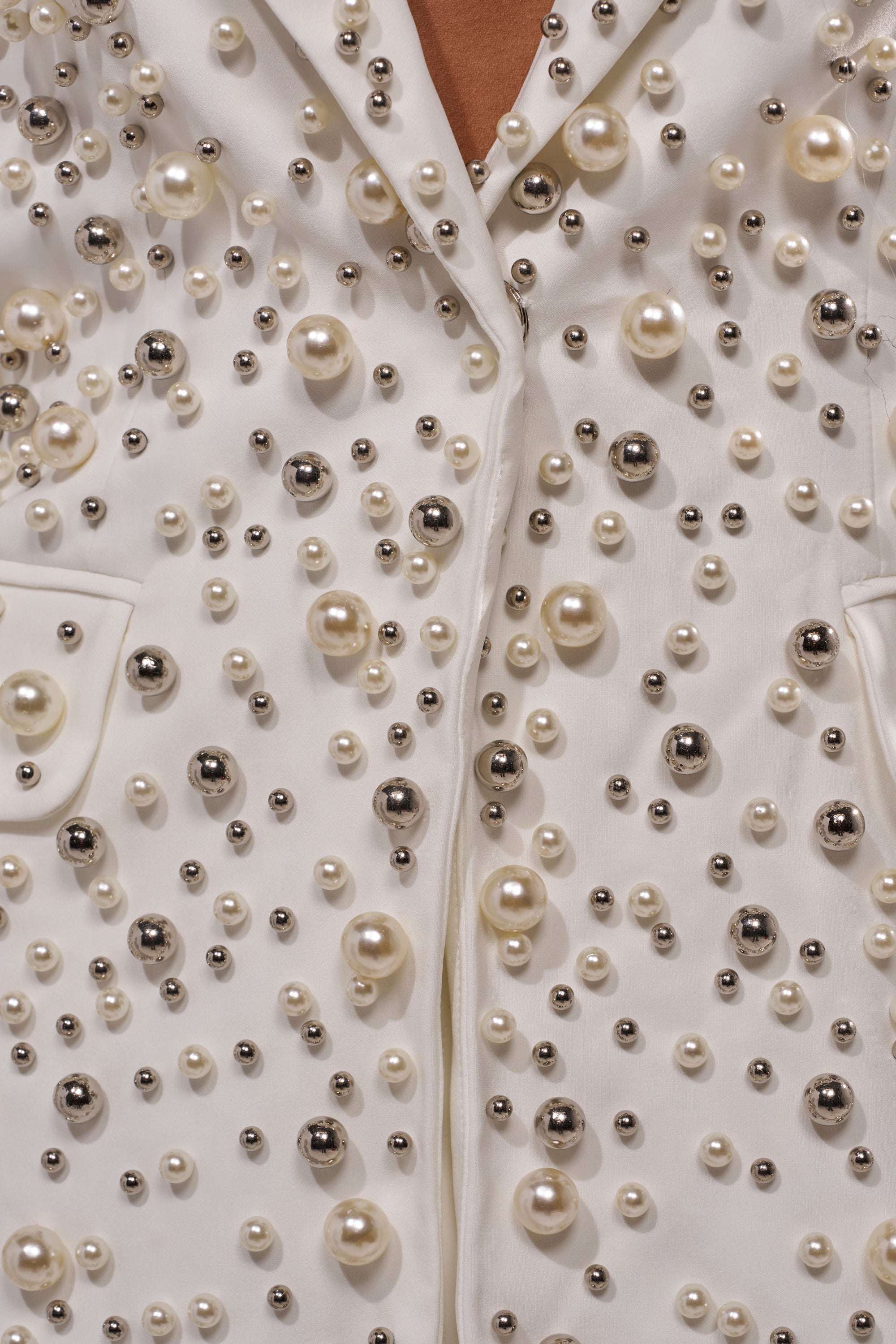 Let’s hear a little commotion for The AKIRA Label Keep It Going Embellished Blazer. Crafted from a sleek suiting fabric, this jaunty jacket features a tailored silhouette with contour seaming, padded shoulders, a plunging neckline framed by a sharp notch-lapel collar, welted waist pockets, silky satin lining, and a snap-button front closure. Adorned with pretty pearls and spherical silver beads throughout, this piece adds unique, head-turning flair to any wardrobe. Pair it with the coordinating Keep It Going Trousers for a perfectly polished look.