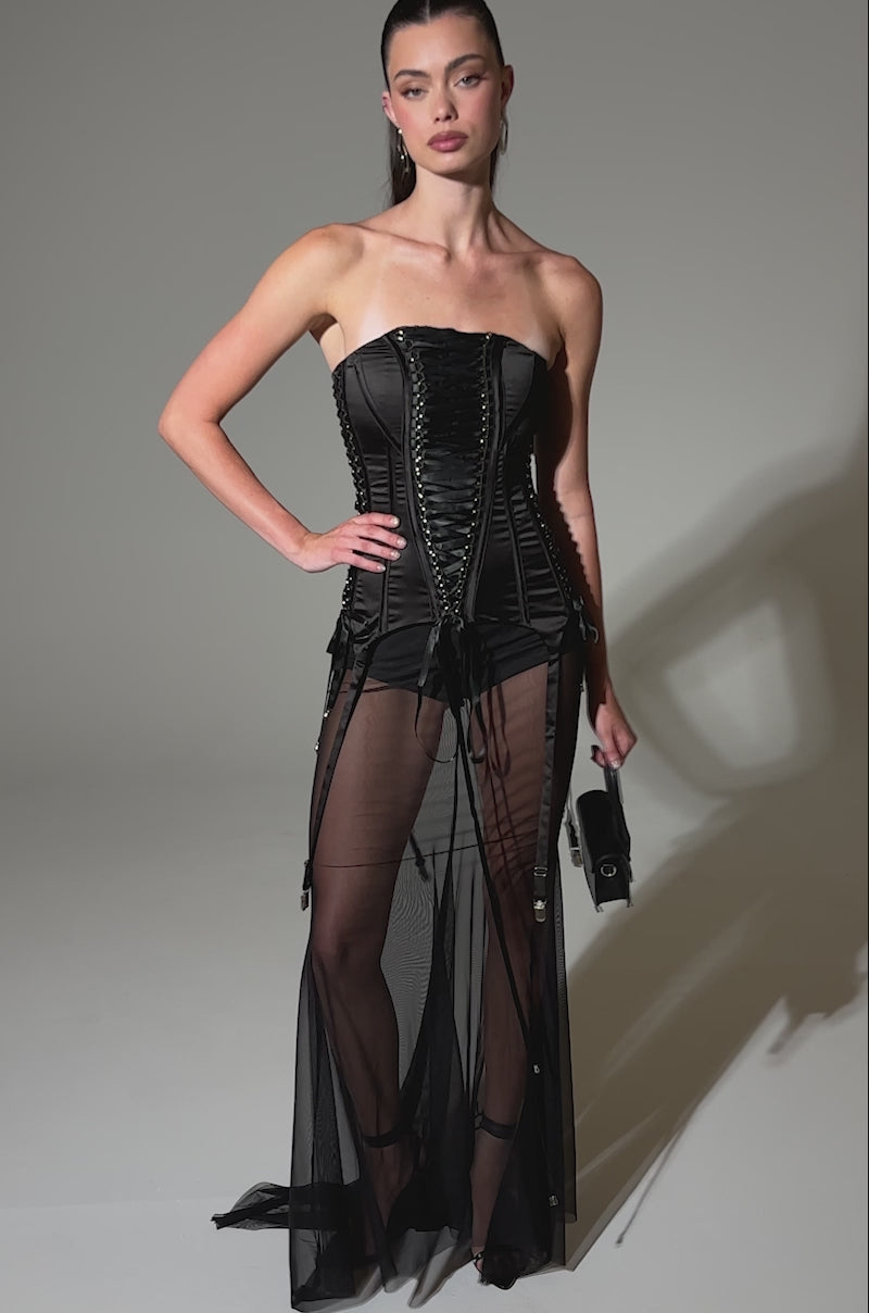 Baddie to the bone. The AKIRA Label Lace Me Up Corset is crafted from sleek, silky satin and features a curve-hugging, strapless silhouette, internal structural boning, a curved hem with adjustable garter straps, a lace-up front closure with tonal satin ribbons, and coordinating, adjustable lace-up side paneling to ensure your perfect fit. Complete with a metallic zip-back closure. Style with faux leather hot shorts for a super-sexy finish.