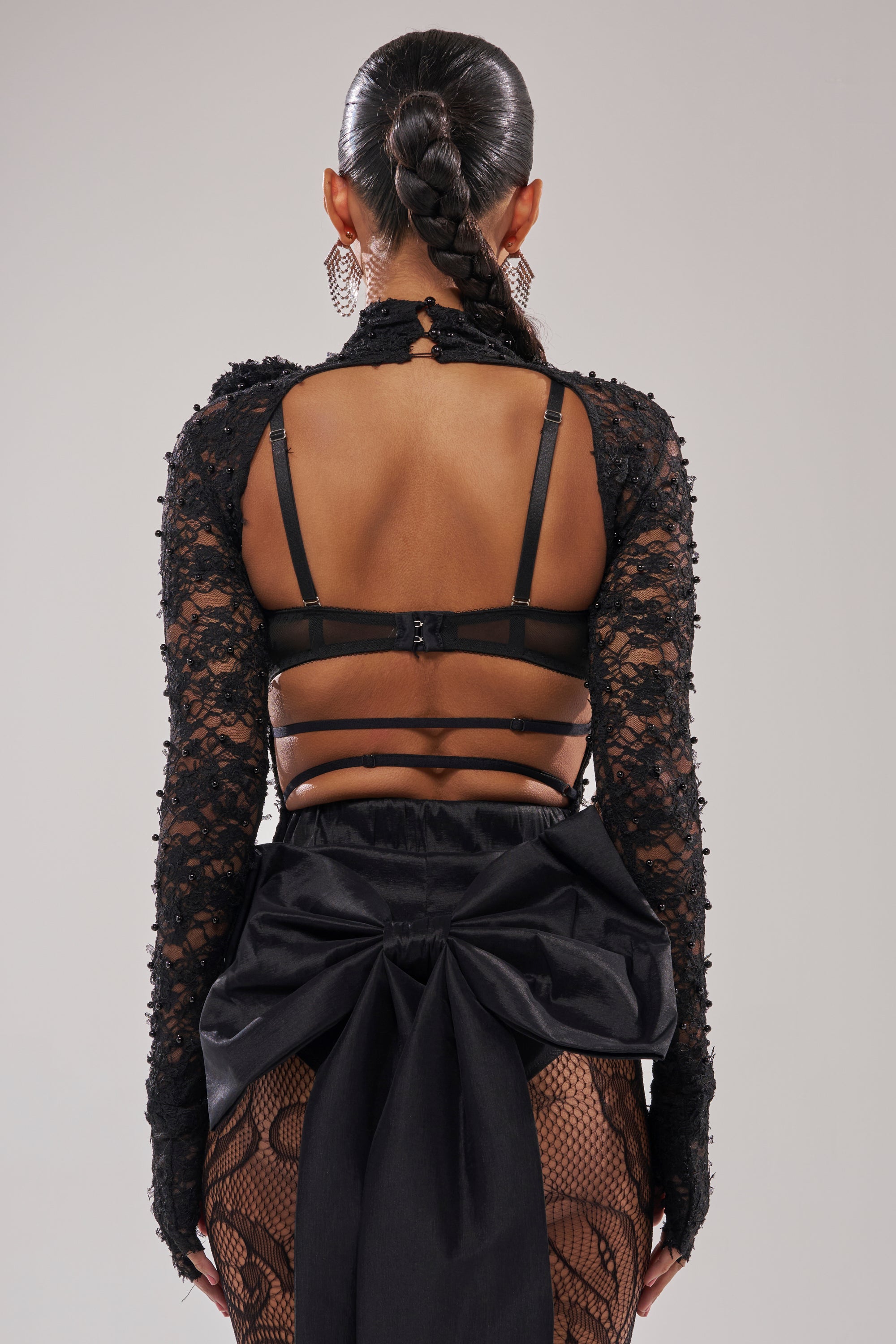 The AKIRA Label Laced In Love Blouse is crafted from sheer floral lace with tonal, glossy beaded detailing interwoven throughout. This sultry top features a mock neck with button closures on the nape, long sleeves with built-in fingerless gloves, an oversized flower applique at the left shoulder, an open-back design, and an elasticized dual lower back strap. Complete with a sculpted, waist-length silhouette. Try styling with a flowy maxi skirt and ballet flats for a finished look.
