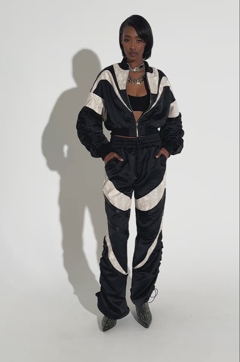 Feel hiss-sterically fabulous in The AKIRA Label Laina Lightweight Bomber. This chic outerwear piece boasts a mix of a luxuriously sleek base and color block panels of faux leather with an embossed snakeskin print, a ribbed knit standing collar, long sleeves with ruched detailing and coordinating ribbed knit cuffs, an elasticized waistband, and a sleek inner lining. Complete with interior padding to keep you toasty, a faux silver metallic front zipper closure, and a boxy, cropped silhouette. Pair with the matching AKIRA Label Laina Lightweight Jogger and chunky sneakers for a streamlined look.