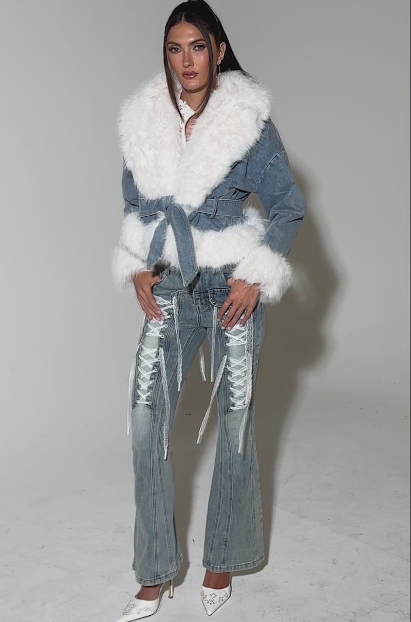 Chase the blues away in The AKIRA Label Lainey Fur Trim Denim Moto. This cozy-chic outerwear piece is crafted from a structured light wash denim base and features a plush faux fur fold-over collar, long sleeves with coordinating fur cuffs, side slant pockets, a tonal self-tie waist belt, and fur trim on the bottom hem. Complete with a plush sherpa inner lining, a cropped robe-like design, and a subtle peplum silhouette. Pair with a knit maxi dress, and stiletto booties for a finished look.