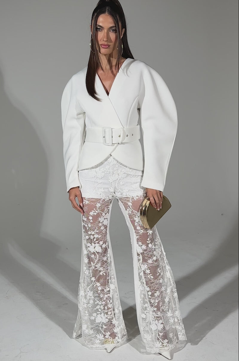 Dress like a boss in The AKIRA Label Lana Scuba Blouse. Designed in a luxe white scuba knit, this blouse features exaggerated sculptural sleeves, a plunging neckline, and a cinched waist with a bold matching belt. The clean lines and architectural volume create a commanding silhouette that bridges runway edge with tailored polish. Pair it with wide-leg trousers or a sleek skirt for an instantly elevated look.
