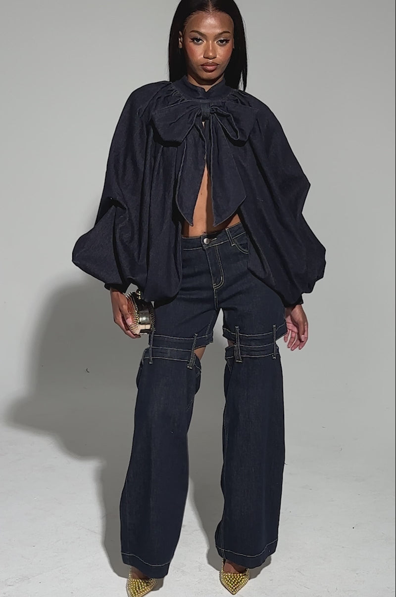 From coffee to cocktails, turn everyday denim into a statement with The AKIRA Label Leah Ruched Denim Mock Neck Top In Dark Blue Denim. Crafted from lightweight dark-wash denim, this bold silhouette features a mock collar with dual button closures at the nape of the neck, an oversized front bow detail, voluminous ruched balloon sleeves with button cuffs, and a chic open-back design.