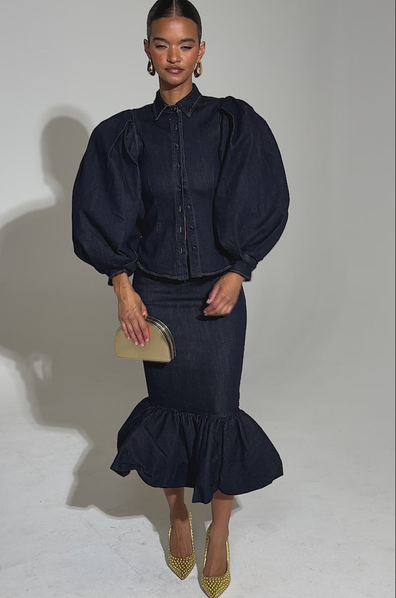 Classic denim meets bold femininity in The AKIRA Label Let’s Change It Up Denim Blouse. Crafted from dark-wash denim, this blouse features a pointed collar, oversized balloon sleeves with button cuffs and inner padding for volume, a traditional button-up front, and a flattering waist-length cut with a gently curved hem. Try styling with the matching AKIRA Label Let’s Change It Up Denim Midi Skirt, strappy stilettos, and metallic jewelry for a polished, denim-on-denim look.