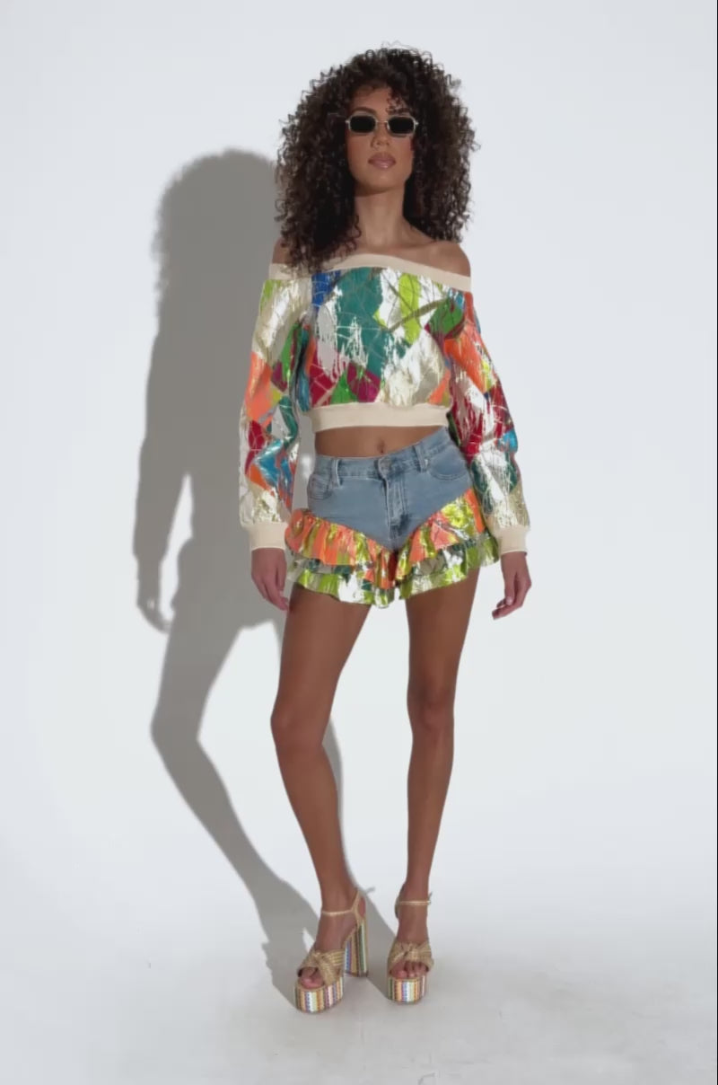 LIFE IS BUT A DREAM BROCADE RUFFLE DENIM SHORTS