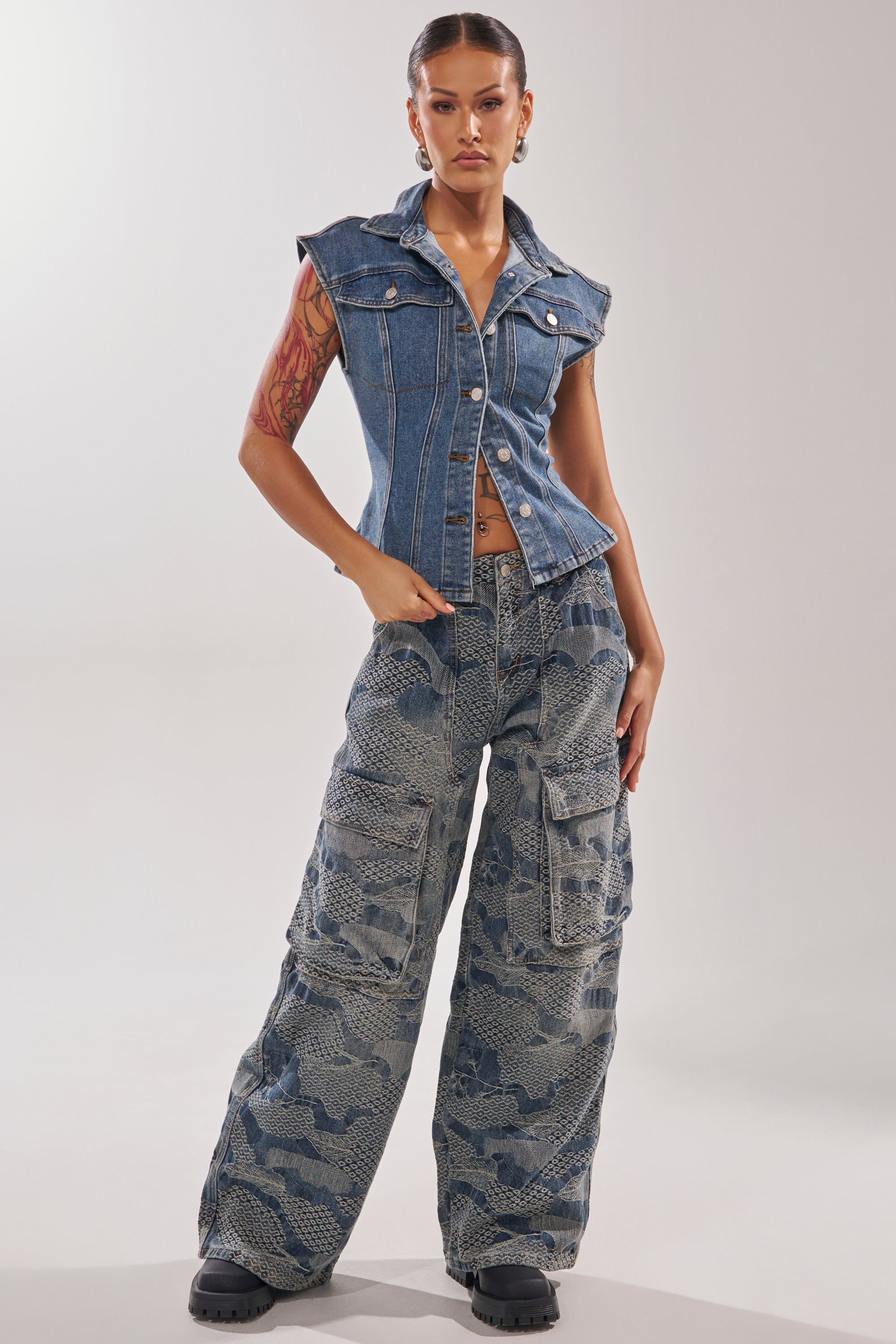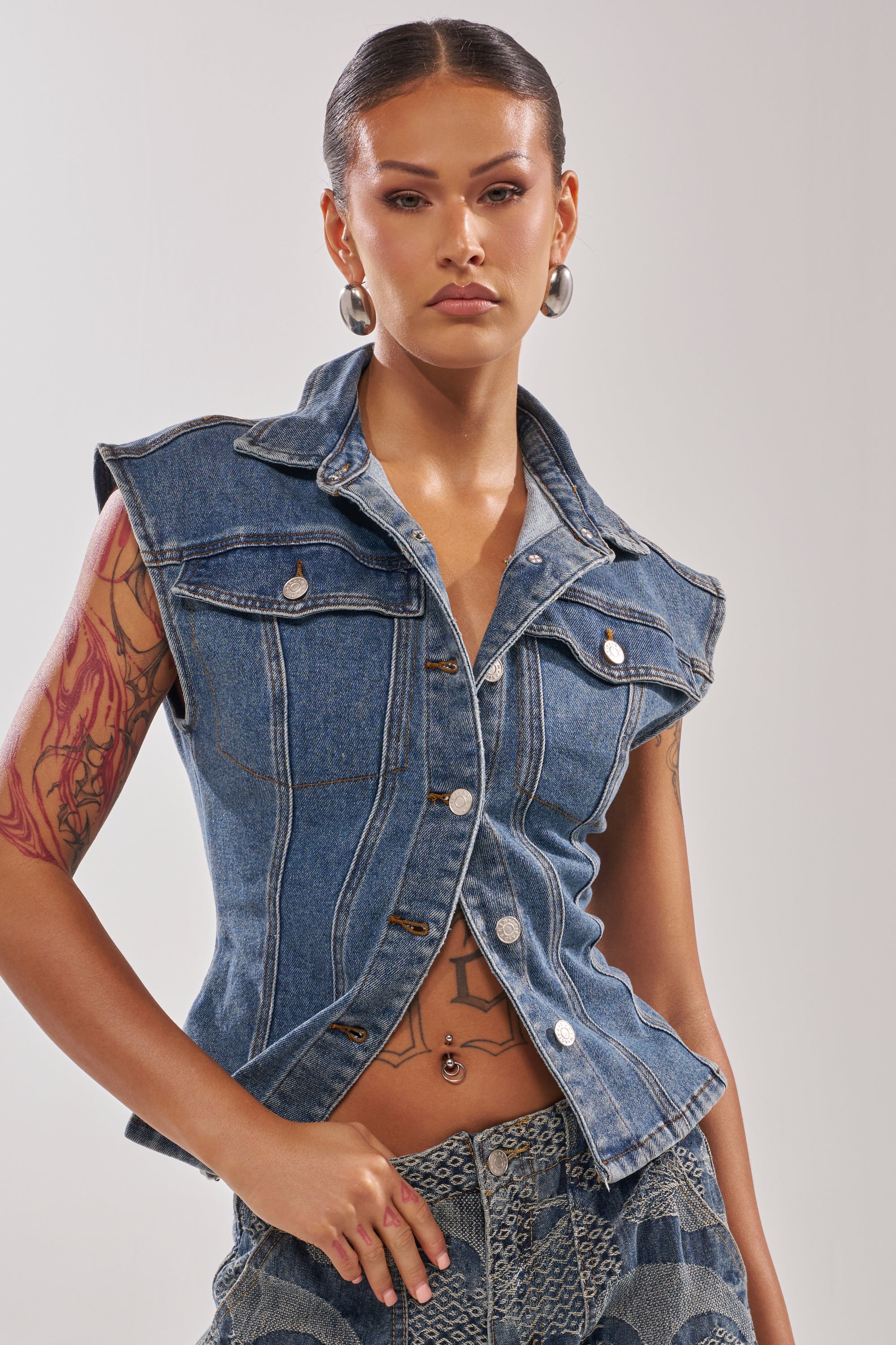 A sleeveless denim vest crafted from structured cotton denim in a dark wash blue colorway. It features a fitted, waist-defining silhouette with a classic pointed collar, a full front button closure with silver-tone hardware, dual chest flap pockets, and vertical seam detailing. The back is finished with an adjustable lace-up tie detail for a customizable fit. Contrast stitching throughout adds a timeless denim finish. Perfect for layering over fitted tops or wearing solo with high-waisted jeans or mini skirts for a sleek, elevated street-style look.
