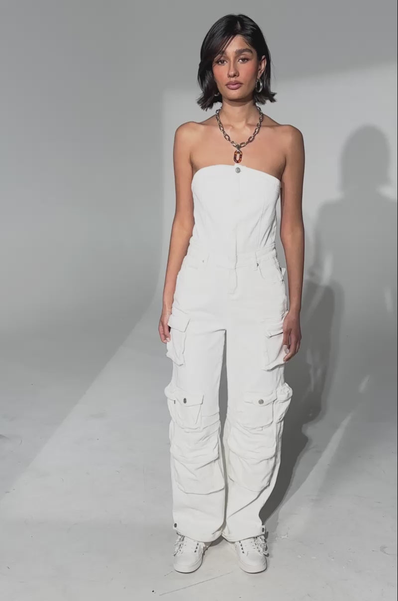 LINDSAY DENIM CARGO JUMPSUIT IN WHITE