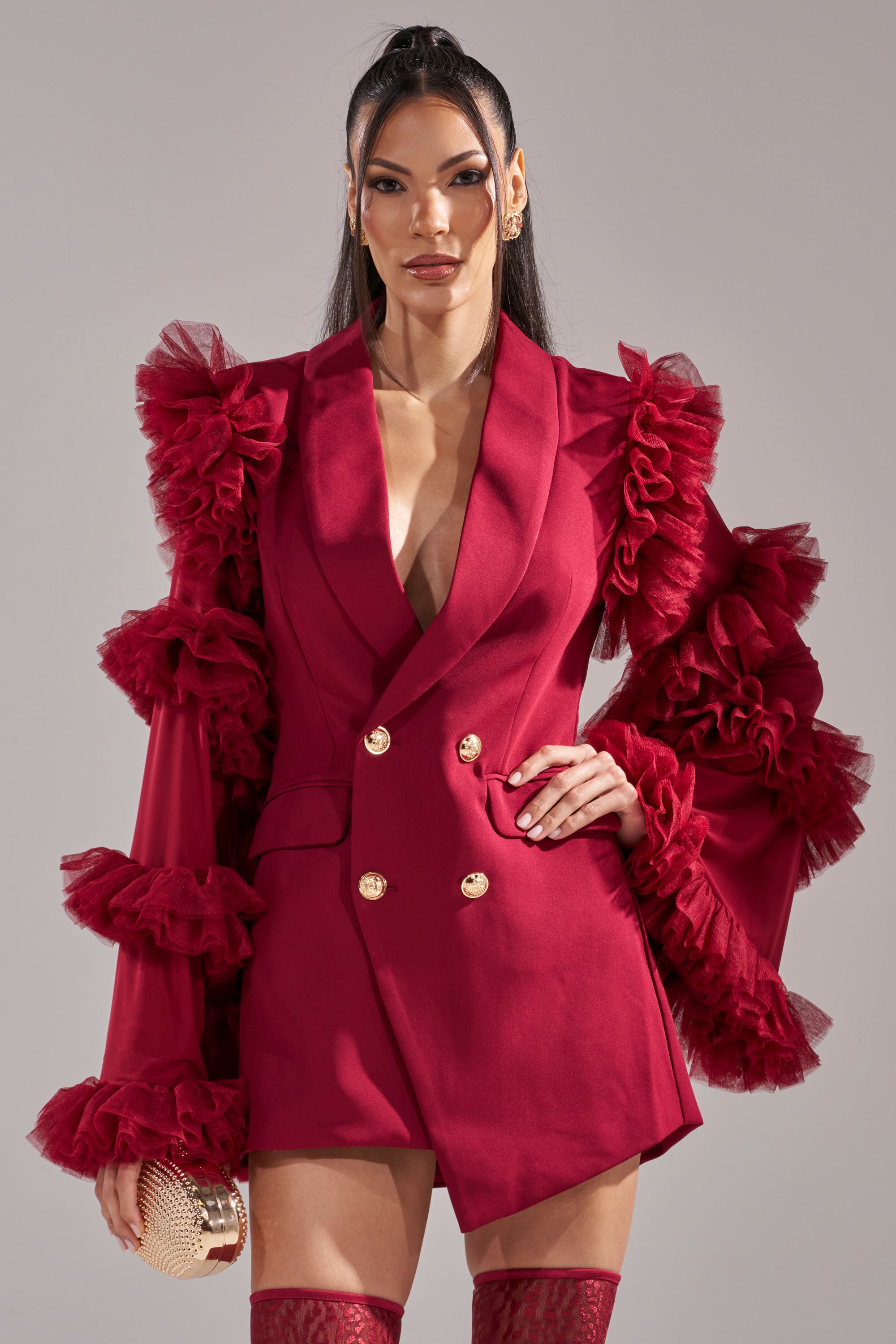 LIVING OVER THE TOP RUFFLE SLEEVE BLAZER MINI DRESS IN BURGUNDY