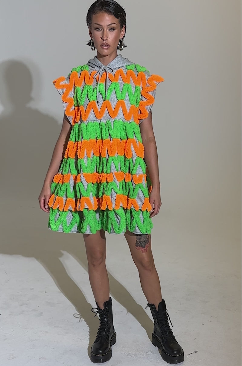 The AKIRA Label Lolo Zigzag Mini Dress is a playful explosion of texture and color, designed for the boldest of wardrobes. This voluminous mini dress is crafted from a cozy sweatshirt fleece base and completely adorned with layers of fuzzy, chenille zigzag appliqués in vibrant neon orange and green. The sculptural silhouette features an attached hood with drawstring closures, exaggerated cap sleeves, and a flared A-line shape. Perfect for festival looks, editorial shoots, or making an unforgettable entrance, this statement piece is unapologetically daring.