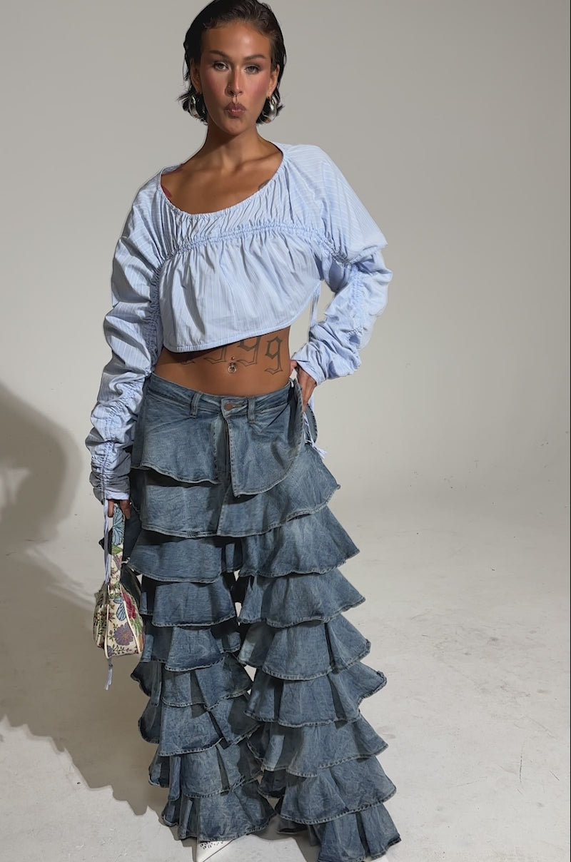 Catch stares and hearts in The AKIRA Label Look This Way Ruffle Denim Pant. Crafted from semi-stretchy, medium-wash denim, these flamboyant bottoms boast a high-rise fit, functional belt loops, two horizontal waist pockets, two concealed rear pockets, a classic front button-zip fly, and flouncy tiered ruffle detailing lining both pant legs. Complete with a wide-leg silhouette. Pair with anything from a fitted blouse to a sultry corset for a high-impact finish.