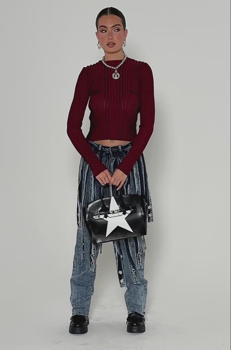 It’s giving body-ody-ody in The AKIRA Label Looking Snatched Striped Knit Top In Red. This flattering piece is crafted from a super stretchy unlined ribbed knit base and features a contrast striped patterning with a subtle shimmery hue, a high rounded neckline, raw hems, long sleeves, and a waist-length silhouette. Pair with a pleated denim mini skirt and moto knee-high boots for a finished look.