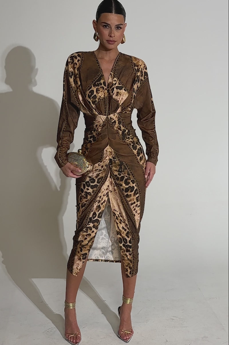 Wear your heart on your sleeve in The AKIRA Label Lots Of Love To Give Midi Dress. This bold, sensual midi dress is crafted from creamy satin and features a luxe, leopard patchwork print, a plunging neckline, long sleeves, ruched detailing at the front of the waist that enhances your curves, and a curve-hugging silhouette. Complete with a sultry front slit. Pair with stiletto pumps, a clutch, and hoop earrings to bless your date with love and hotness.
