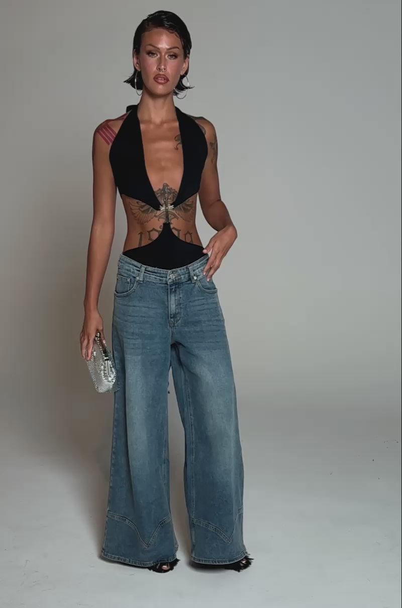 Spread the love in The AKIRA Label Lots To Give Bodysuit. Crafted from a sleek and stretchy fabric, this sultry one-piece features self-tie halter straps with a plunging neckline, bold cutout detailing at the waist, coordinating self-tie back straps, a cheeky thong bottom, and a statement faux silver metallic cross pendant at the sternum that connects the upper and lower half. Complete with a curve-hugging silhouette. Style with flared leg denim and western accessories for an effortlessly sexy finish.