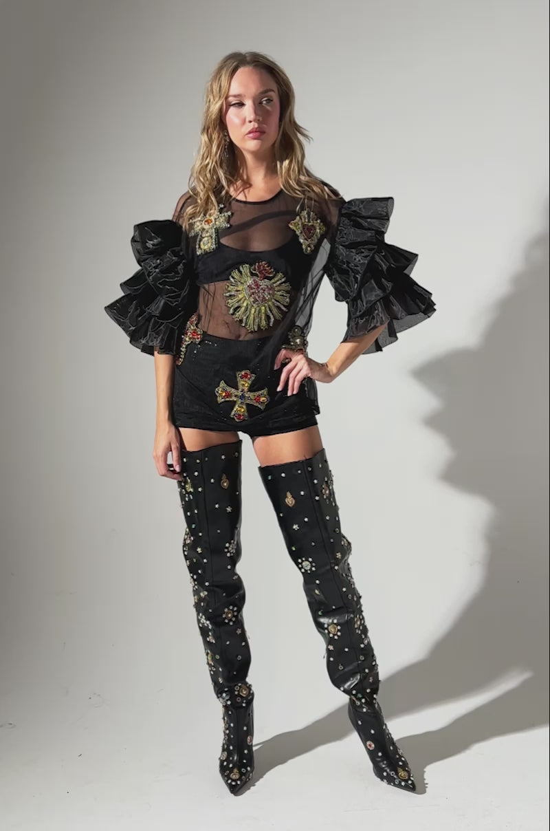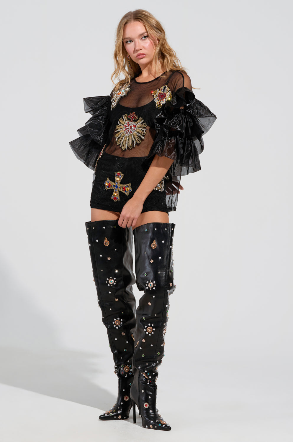 Feeling heartbroken? Don’t worry, The AKIRA Label Love Hard Top has you covered. This gorgeous top is crafted from an unlined, semi-stretchy sheer mesh knit base and features a crew neckline, mid-length sleeves with flamboyant layered ruffle detailing, and intricate embroidered cross and heart-shaped patches adorned with rhinestone and gemstone embellishments throughout the front. Complete with an oversized, longline silhouette, and an easy, pull-on fit. Pair atop a bandeau with leather pants and stilettos for an edgy finish. Shown undergarment not included.