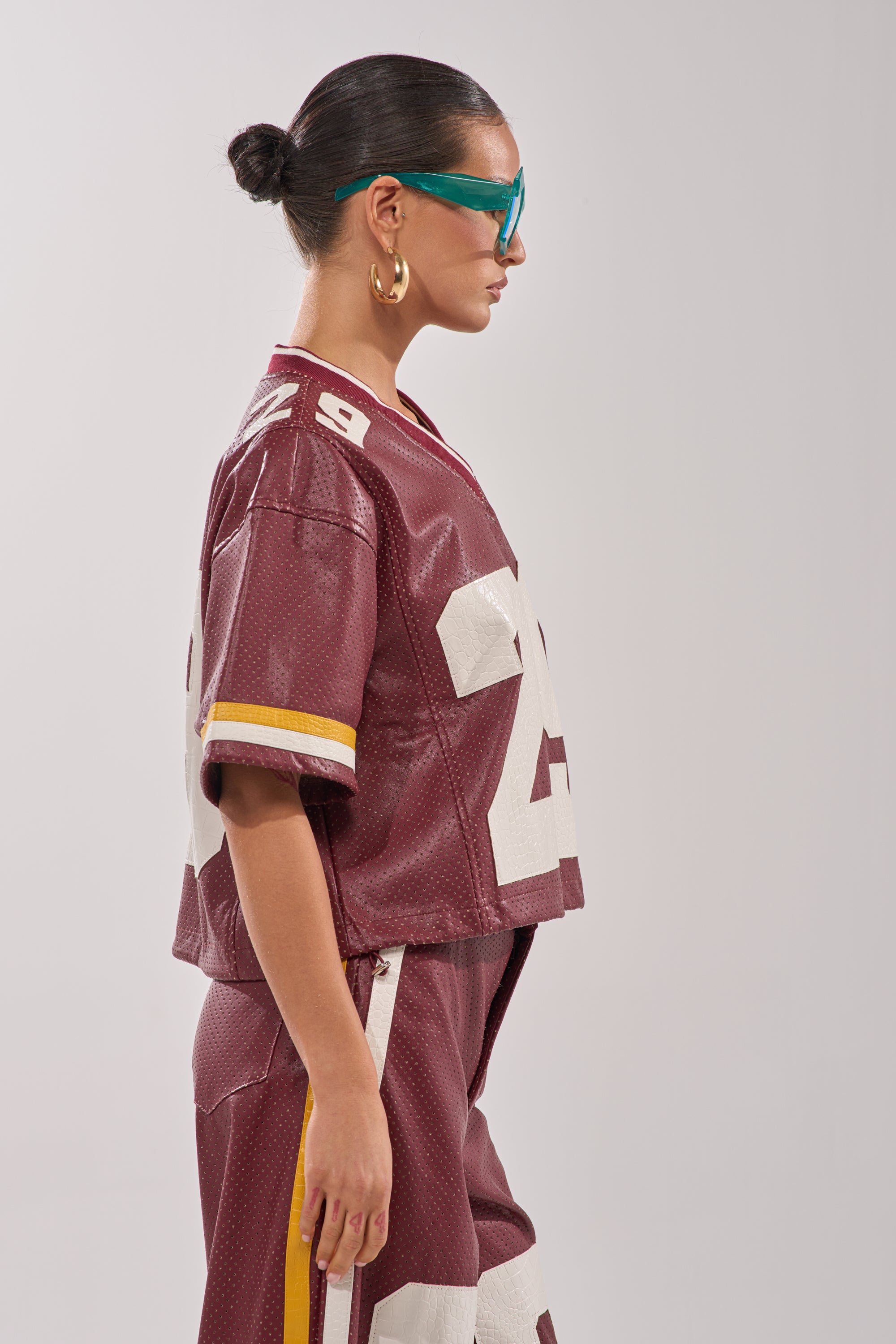 A sporty-chic faux leather perforated burgundy jersey featuring an athletic, perforated design, a ribbed knit V-neckline, relaxed short sleeves, croc-embossed faux leather striped detailing throughout, and oversized “29” varsity-style number detailing on the front and back for a standout finish. Complete with an adjustable bungee cord fastening at the hemline so you can wear it loose or cinch it in for a cropped, snatched fit. Pair it with the coordinating AKIRA Label Lucky 29 Trouser, platform boots, and mini sunnies for an effortlessly cool finish.