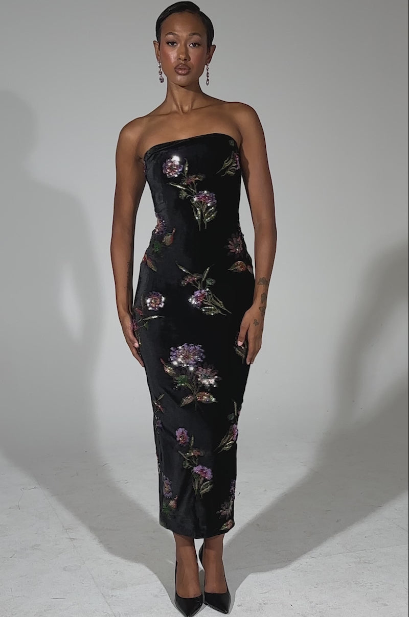 LUNA BEADED FLORAL VELVET MIDI DRESS