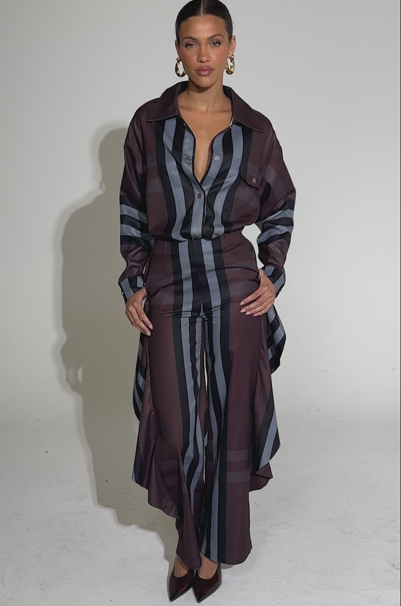 Live lavishly in The AKIRA Label Luxury Life Plaid Button Down. Crafted from a sleek fabric with a bold vertical plaid pattern throughout, this elegant top features a classic pointed collar, long sleeves with snap button cuffs, silver metallic hardware, one chest pocket, and coordinating snap-button front closures. Complete with a relaxed, boxy silhouette. Style it with the matching AKIRA Label Luxury Life Plaid Palazzo Pant, stiletto booties, and chunky jewelry for a finished look.