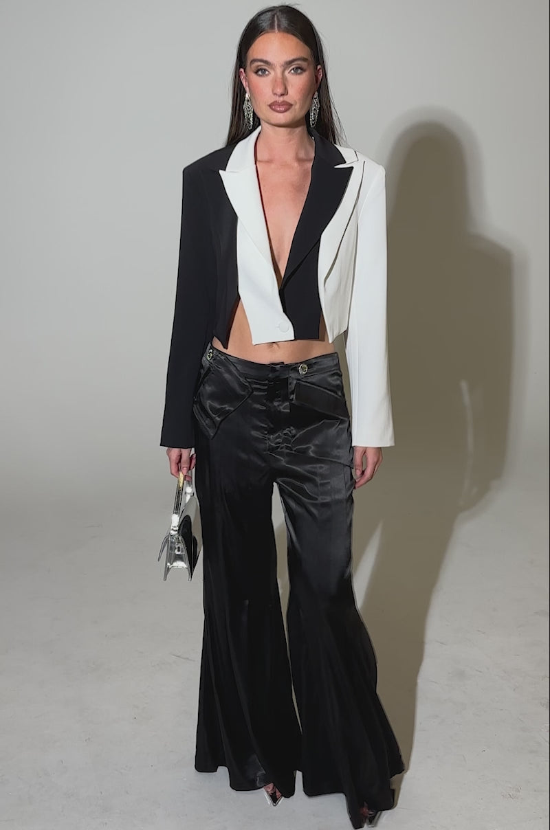 Seeing double? The AKIRA Label Made You Look Double-Layer Blazer is a cropped, tailored style featuring a striking black and white colorblock design that creates a two-tone, layered illusion. A structured lapel, sharp, padded shoulders, and a single-button closure elevate the silhouette, while the contrast paneling adds visual depth. Perfect for pairing with high-waisted trousers or a fitted skirt for a high-fashion finish.