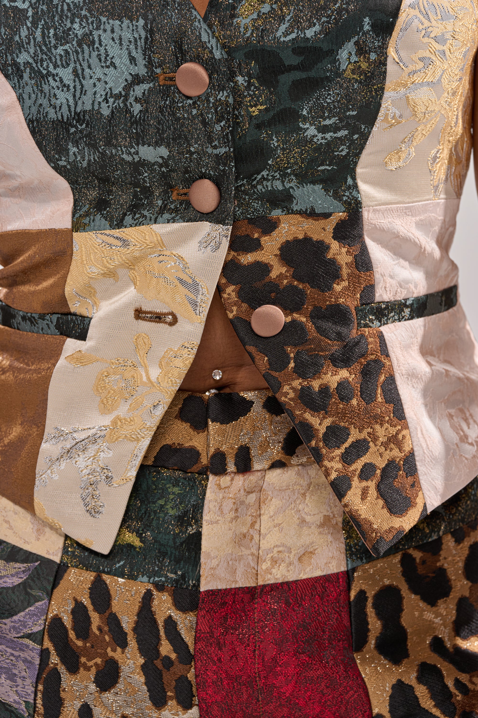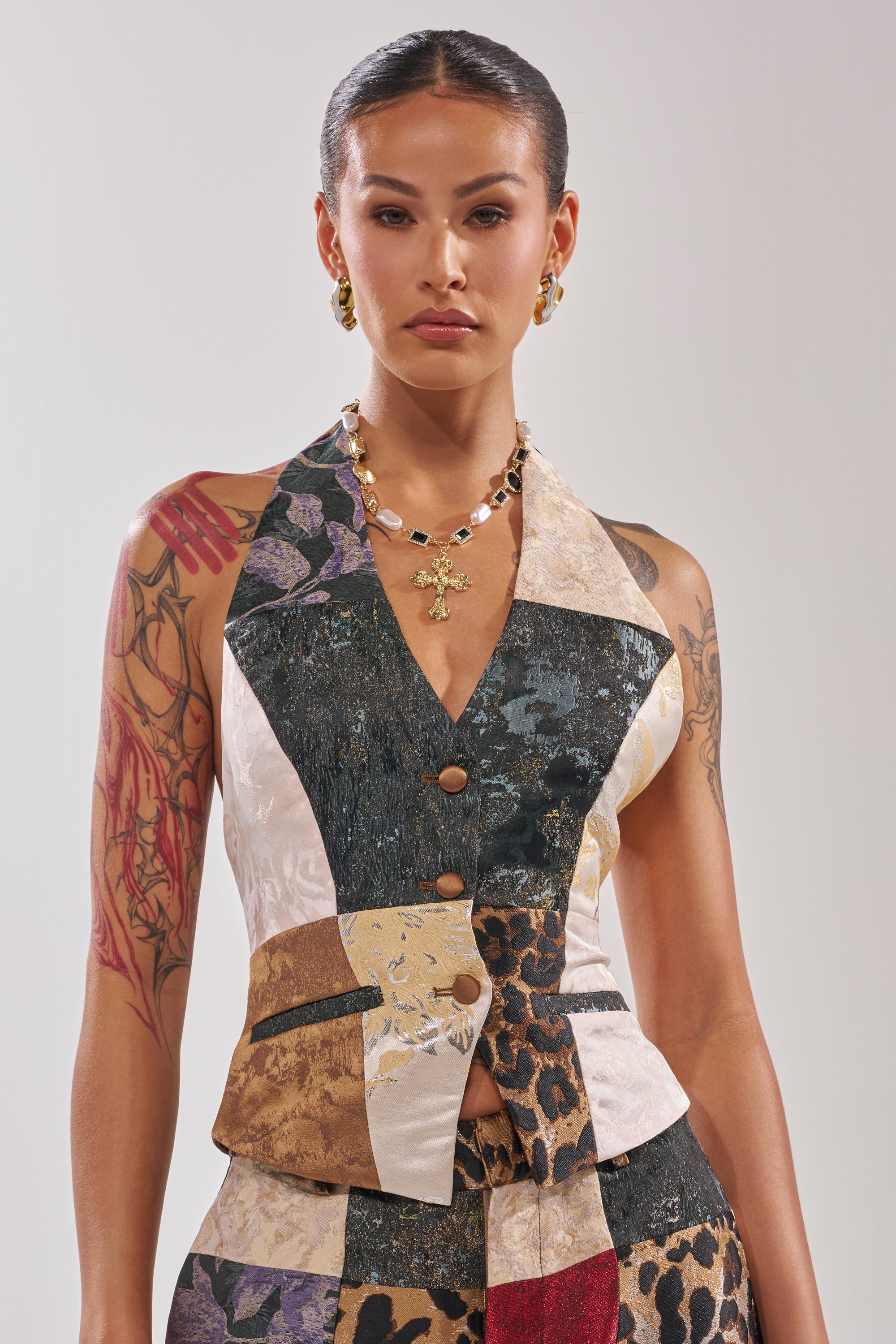 Have them doing double-takes when you’re wearing The AKIRA Label Made You Look Patchwork Halter Vest. This elegant top is crafted from an eclectic mix of luxurious woven fabrics, including brocade, jacquard, animal print, floral patterns, and textured metallic panels arranged in a patchwork layout. It features a halter-style neckline, a sleeveless design, a panel of button front closures, welted pockets, an adjustable lower back strap to cinch the waist, and a sharply tapered hemline. Complete with a structured, body-skimming silhouette. Pair it with the matching AKIRA Label Made You Look Patchwork Blazer, Made You Look Patchwork Trouser, and platform loafers for an elevated night-out look.
