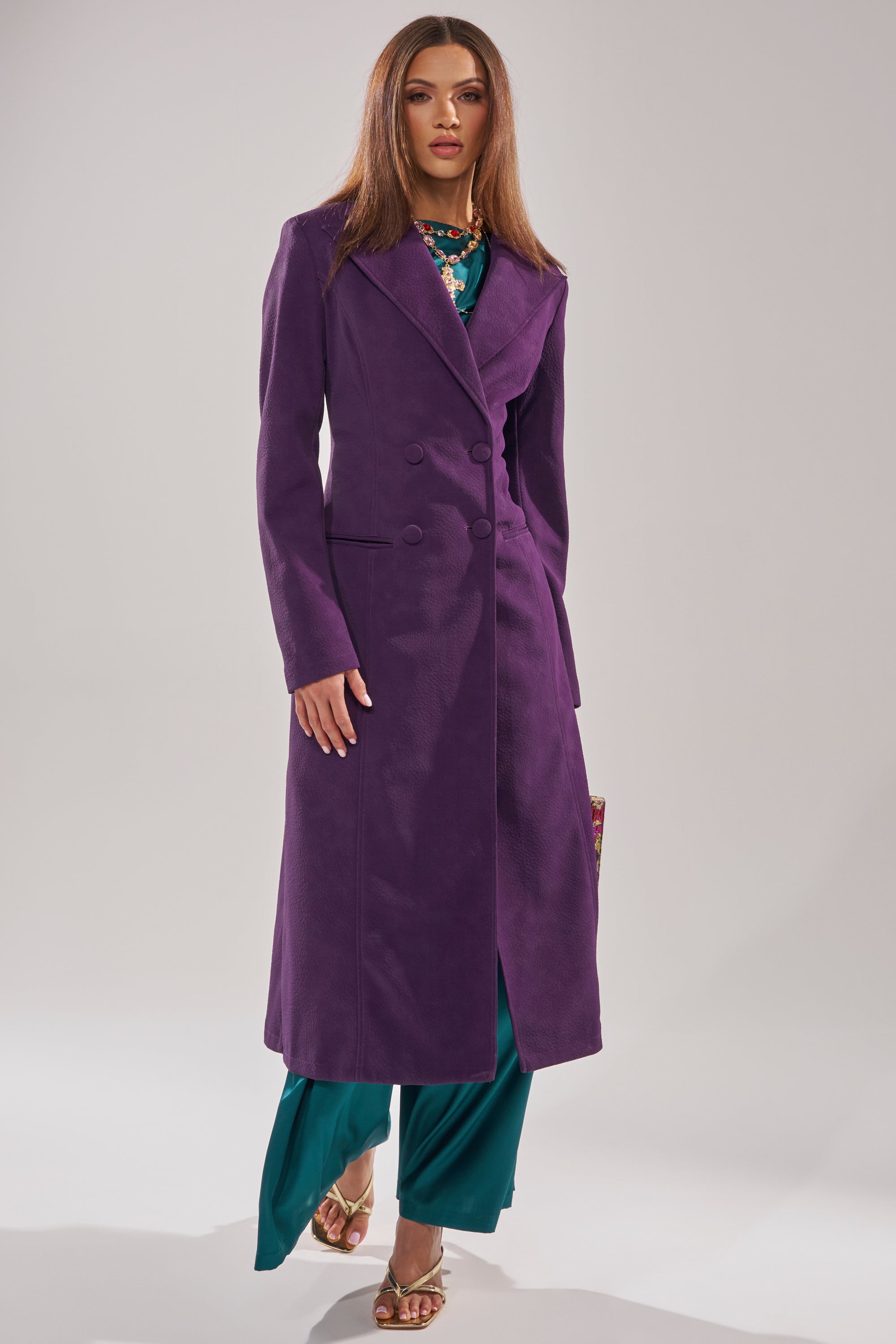 The AKIRA Label Maeve Suede Feel Trench is fall’s softest power move. Crafted from buttery smooth faux leather, this longline jacket boasts a notched lapel collar, lightly padded shoulders, long sleeves, dual waist pockets, a back vent slit, and a satin inner lining. Complete with a double-breasted button front closure. Throw over turtlenecks or chunky knit sweaters for effortless style.