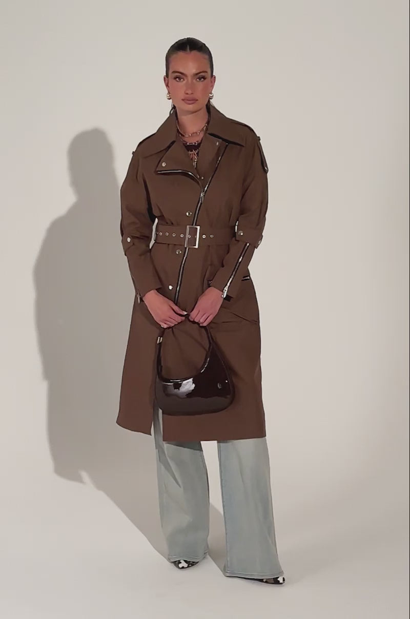Catch you in the city in The AKIRA Label Manhattan Asymmetrical Trench. This city chic outerwear piece is crafted from a non-stretch cotton blend fabrication and features a wide notch lapel collar, faux silver metallic hardware, shoulder snap-button epaulets, long sleeves with snap-button strappy accents at the elbows and zippered cuffs, a slanted front zipper with double breasted snap button closures, functional belt loops with a coordinating waist belt, and a front pocket with a mock zipper accent. Complete with an oversized, longline silhouette. Pair over denim and heeled booties for a sleek ensemble.