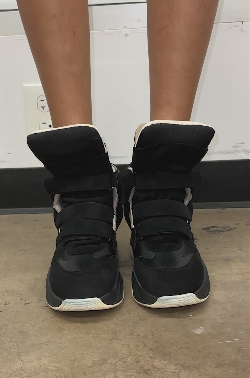 The Maranto Chunky Black Wedge Heel Sneaker features a faux leather and faux suede mixed material upper, a high top shaft, a tonal design, a concealed inner wedge heel, velcro strap detailing, and an almond toe silhouette. Complete with a padded tongue, a thick padded collar, and a textured rubber outsole. Style with cozy coordinating sets for an elevated casual look.