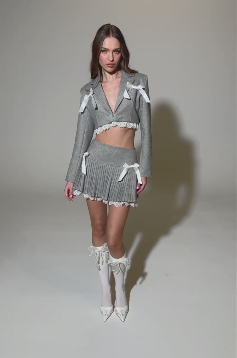Keep it short ‘n sweet in The AKIRA Label Marley Lace Trim Blazer. Crafted from a soft wool-inspired fabrication, this jacket features a cropped silhouette, a plunging neckline with a notch-lapel collar, lightly padded shoulders, long sleeves with decorative buttons, two satin bow appliques, and scalloped lace trim along the hem with a dainty, doily-like pattern. Complete with slick satin interior lining and a concealed hook-and-eye front closure. Pair it with the Marley Lace Trim Mini Skirt for a polished, preppy finish.