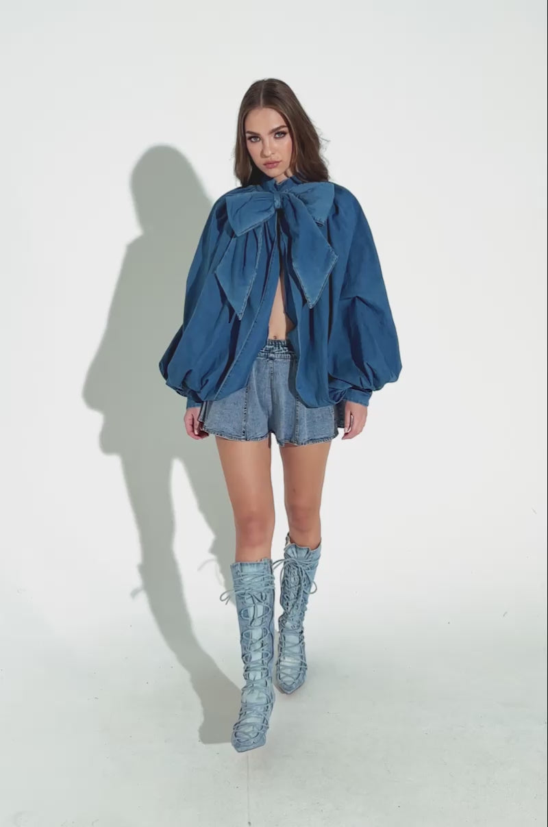 MASTERPIECE MEDIUM DENIM LONG SLEEVE PUFF BLOUSE