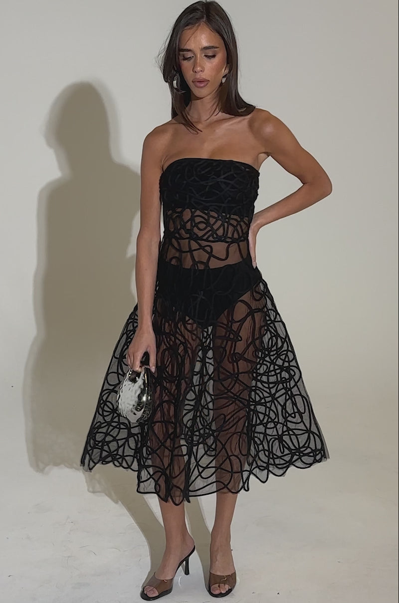 Avant-garde artistry meets sensual elegance. The AKIRA Label Mayra Abstract Midi Dress is a sheer, strapless piece that plays with visual movement and texture. Crafted from a translucent mesh base, it features a swirling overlay of bold black cord-like embroidery that forms an allover abstract pattern. The structured bodice cinches at the waist before flaring into a soft A-line silhouette, offering both shape and flow. Complete with a back zipper closure.