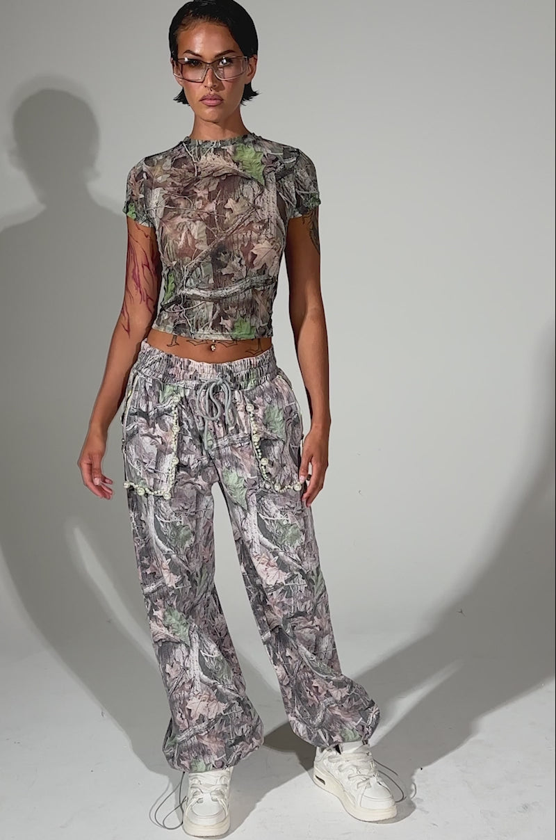 Step into laid-back statement style with The AKIRA Label Meet Me Halfway Wide Leg Pant. Crafted from a lightweight, hunting camo-print fabric, these cozy-chic pants feature a relaxed wide-leg silhouette, a high-rise fit, a shirred elastic waistband with an adjustable drawstring closure, oversized zippered cargo-style flap pockets lined with stunning faux pearl trim detailing. Complete with adjustable bungee cord closures at the pant cuffs for an optional cinched look. Style with the coordinating AKIRA Label Meet Me Halfway Sweatshirt, Meet Me Halfway Printed Mesh Tee, and platform sneakers.