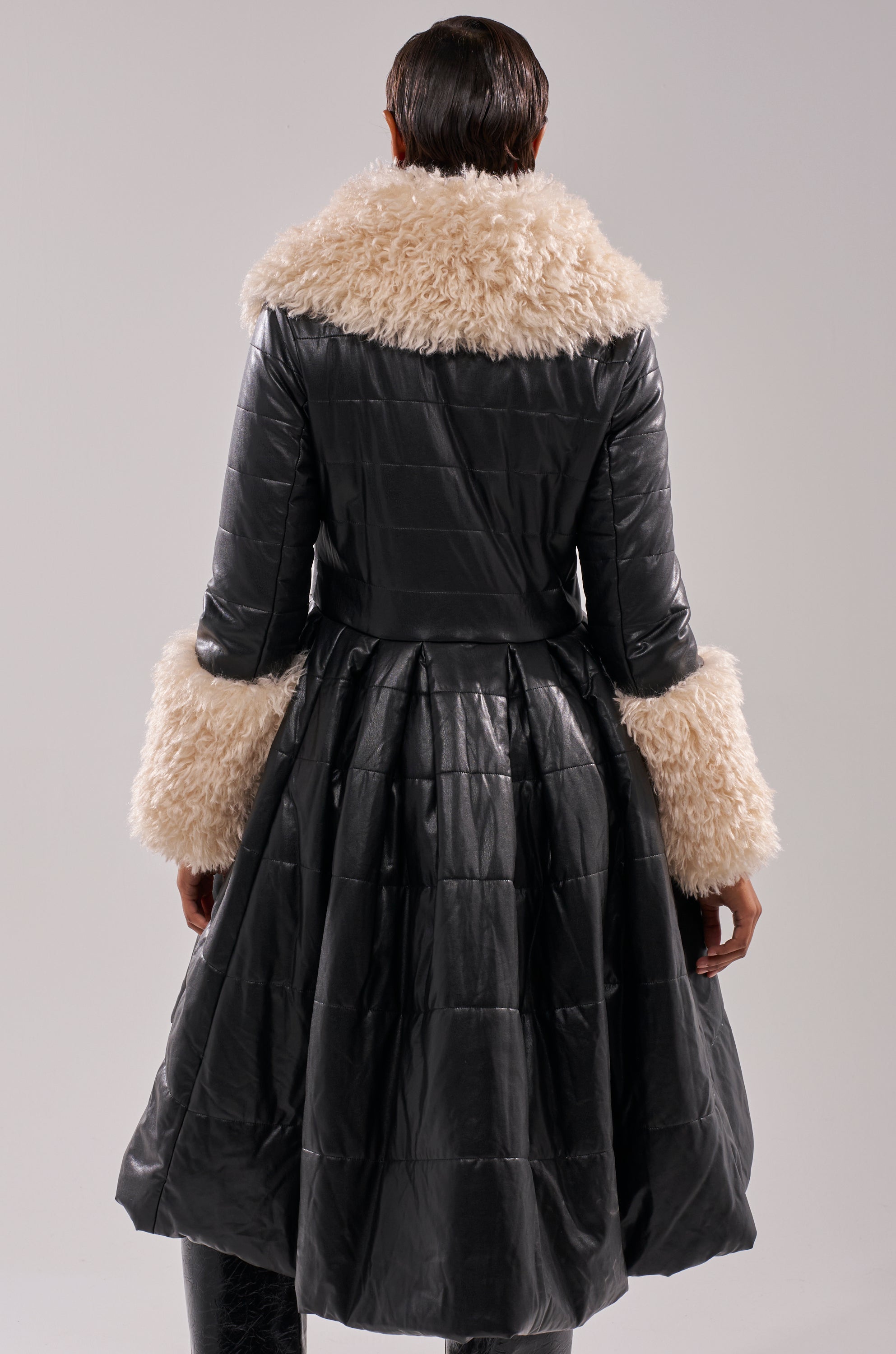 Winter-chic is easy to achieve in The AKIRA Label Midtown Peplum Puffer In Faux Leather. This elevated jacket is crafted from a padded, faux leather puffer base with ultra-fluffy, faux fur trim detailing including on the oversized collar and sleeve cuffs. It features a non-removable fur collar, long sleeves, snap-button front closures, and a sculpted waist that flows into an A-line hemline. Complete with a longline silhouette.