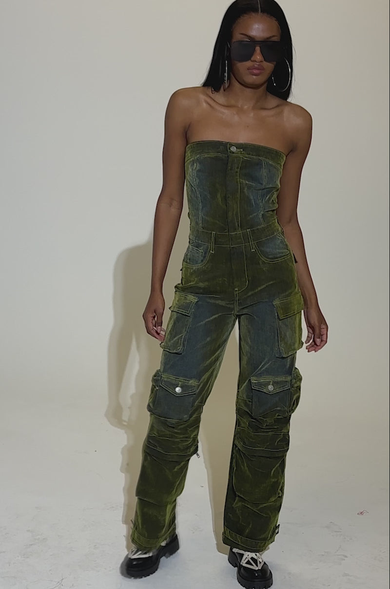Rock a tomboy chic vibe with The AKIRA Label Mira Distressed Velvet Denim Jumpsuit. Crafted from velvety, acid wash stretch denim in a deep green hue, this utilitarian-inspired one-piece features a strapless, straight neckline and a full-length, wide-leg silhouette with cargo-style flap pockets at the thigh, hip, and calf. Complete with a distressed finish, dimensional contrast seam details, functional belt loops, and a zip-button front closure. Style with chunky combat boots and a bold jewelry stack for a casually cool look.