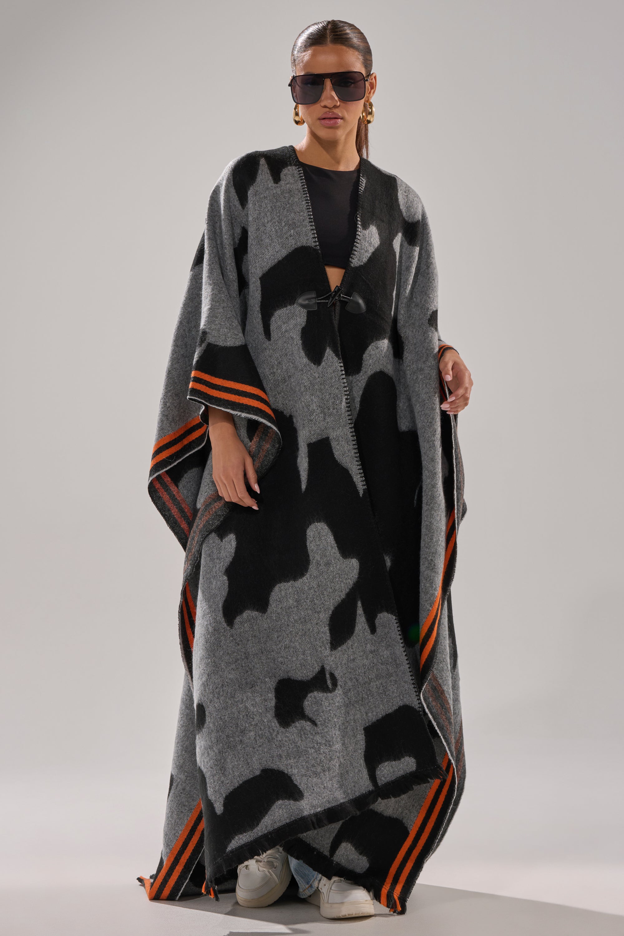 Spice up your cozy wardrobe with The AKIRA Label Mod Life Camo Poncho. This must-have accessory is crafted from an ultra-soft knit fabrication and features a bold, two-tone abstract patterning throughout, contrast striped detailing on the hemlines, and a single horn toggle closure at the center. Complete with a flowy, maxi length. Style atop sweaters and crewnecks for ultra warmth and style.