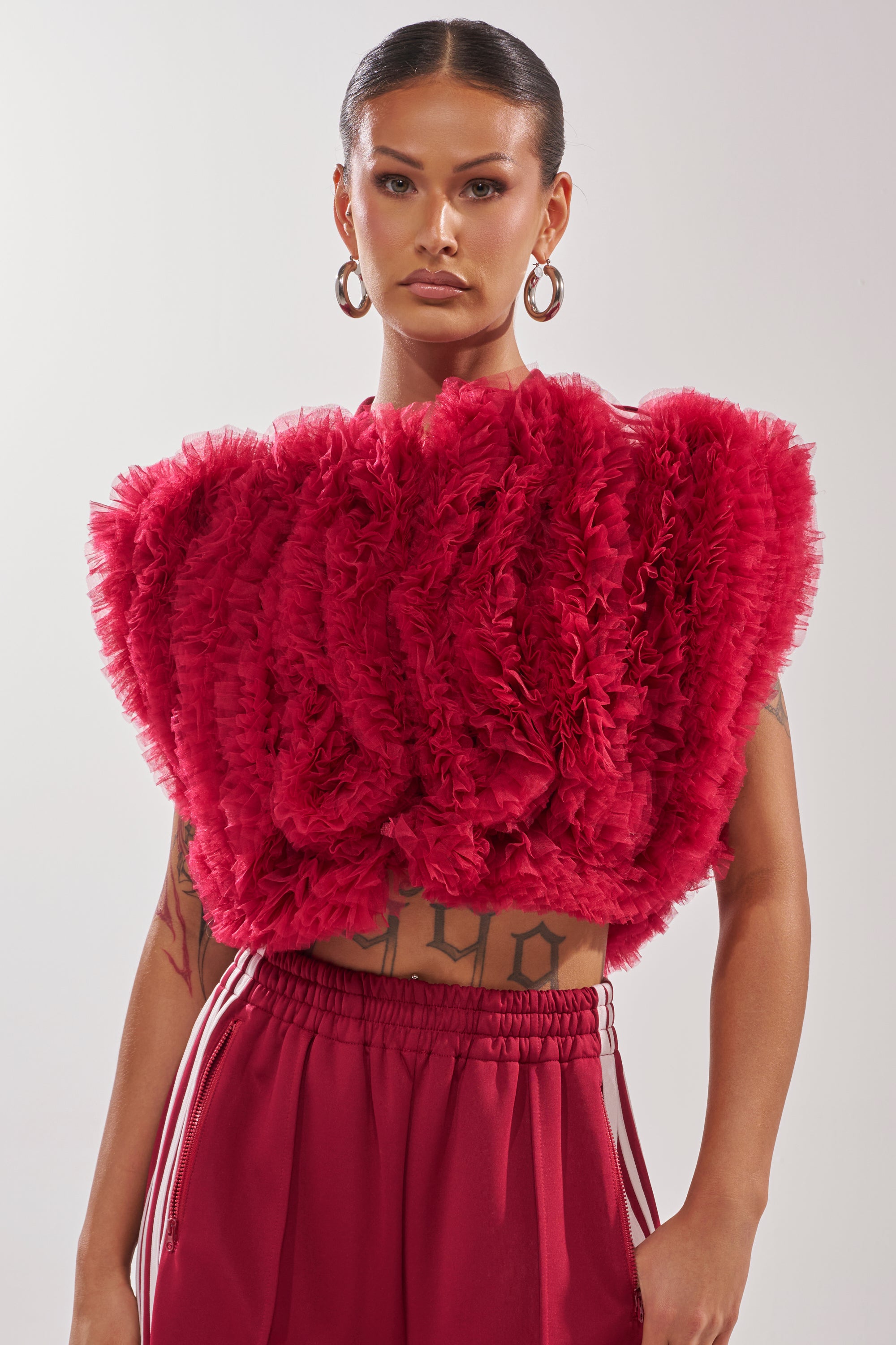 Level up your athleisure with The AKIRA Label Modern Jam Sweatshirt With Tulle in Burgundy. This bold style is crafted from a sleek, sporty fabric and boasts a boxy silhouette with voluminous, tonal tulle ruffles along the shoulders, sides, and hem. It also features a sleeveless design, contrast striped detailing along the shoulders, open side seams with self-tie closures, and a hidden zip-front closure. Style with the coordinating AKIRA Label Modern Jam Track Pant and platform sneakers to hit the ground running.