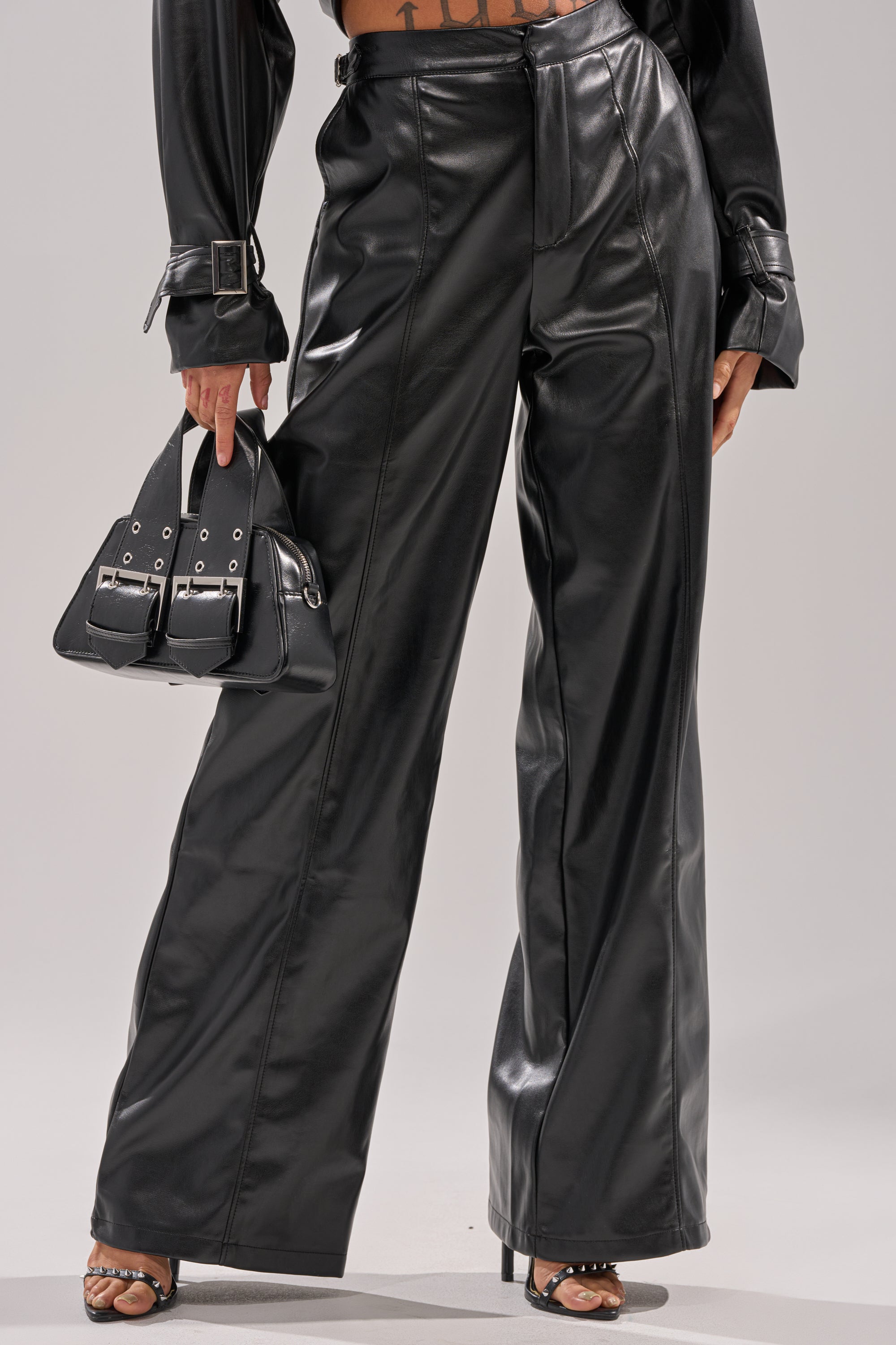 All bets on The AKIRA Label Monte Carlo Wide Leg Pant In Black. Crafted from buttery smooth faux leather, these sleek bottoms feature a high-rise fit, adjustable buckled straps on each side of the waistband, a four-pocket design, and a concealed front zipper with dual hook-and-bar fastenings. Complete with a relaxed, wide-leg silhouette. Style with the matching AKIRA Label Monte Carlo Hooded Moto In Black, stiletto boots, and hoop earrings for an effortlessly polished finish.