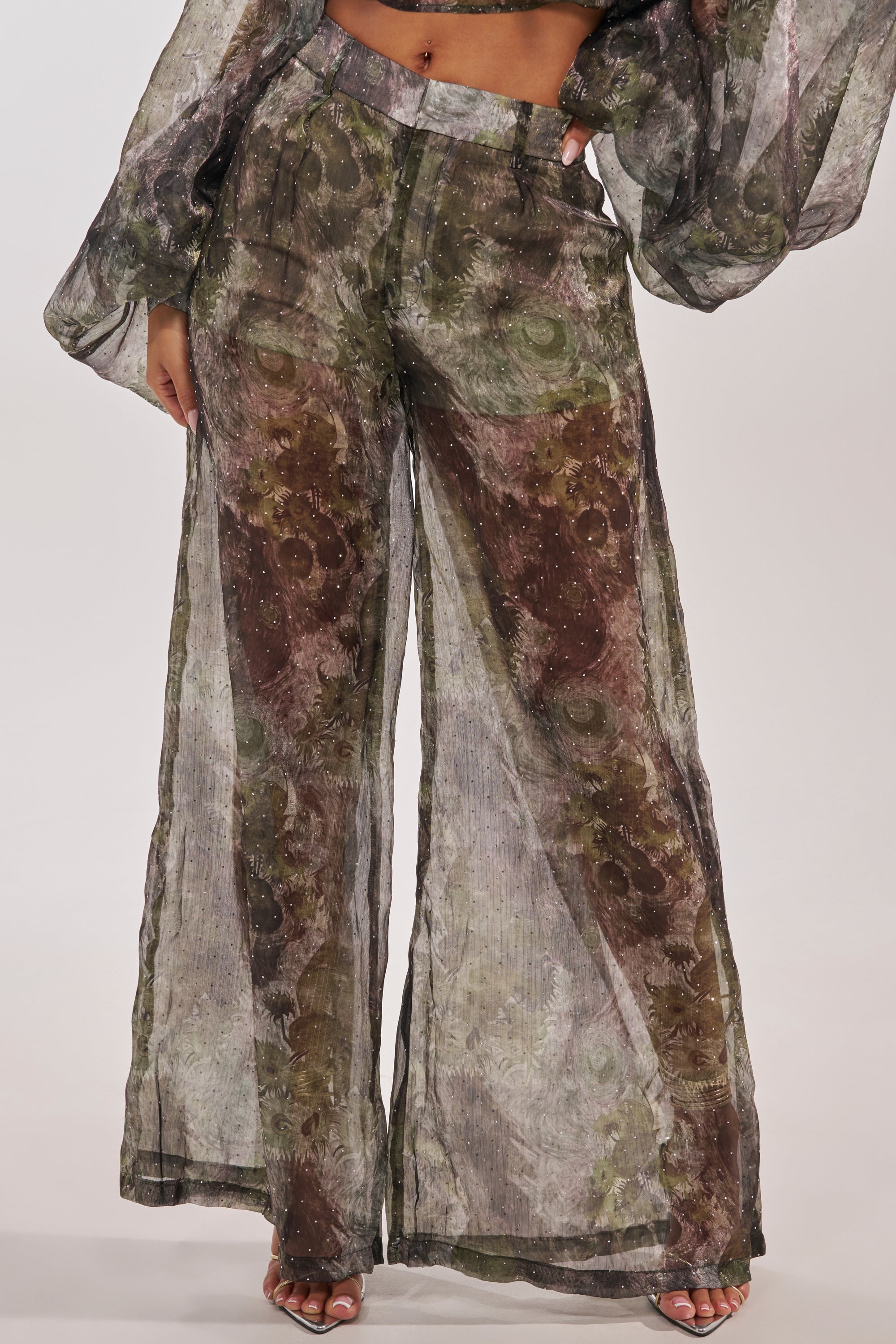 Printed floral high-waisted wide-leg pants designed in a sheer chiffon overlay, making them a sophisticated option for vacations, cocktail gatherings, and dressy occasions. Featuring a relaxed full-length silhouette, smooth waist with functional belt loops, and a front zip-and-clasp closure, these pants create elongating lines and soft movement with every step. The green and grey abstract floral print and delicate rhinestone accents add depth and visual interest. Finished with inner elastic shorts for extra coverage, this piece pairs effortlessly with the matching AKIRA Label Mystique Floral Chiffon Blouse for a coordinated look.