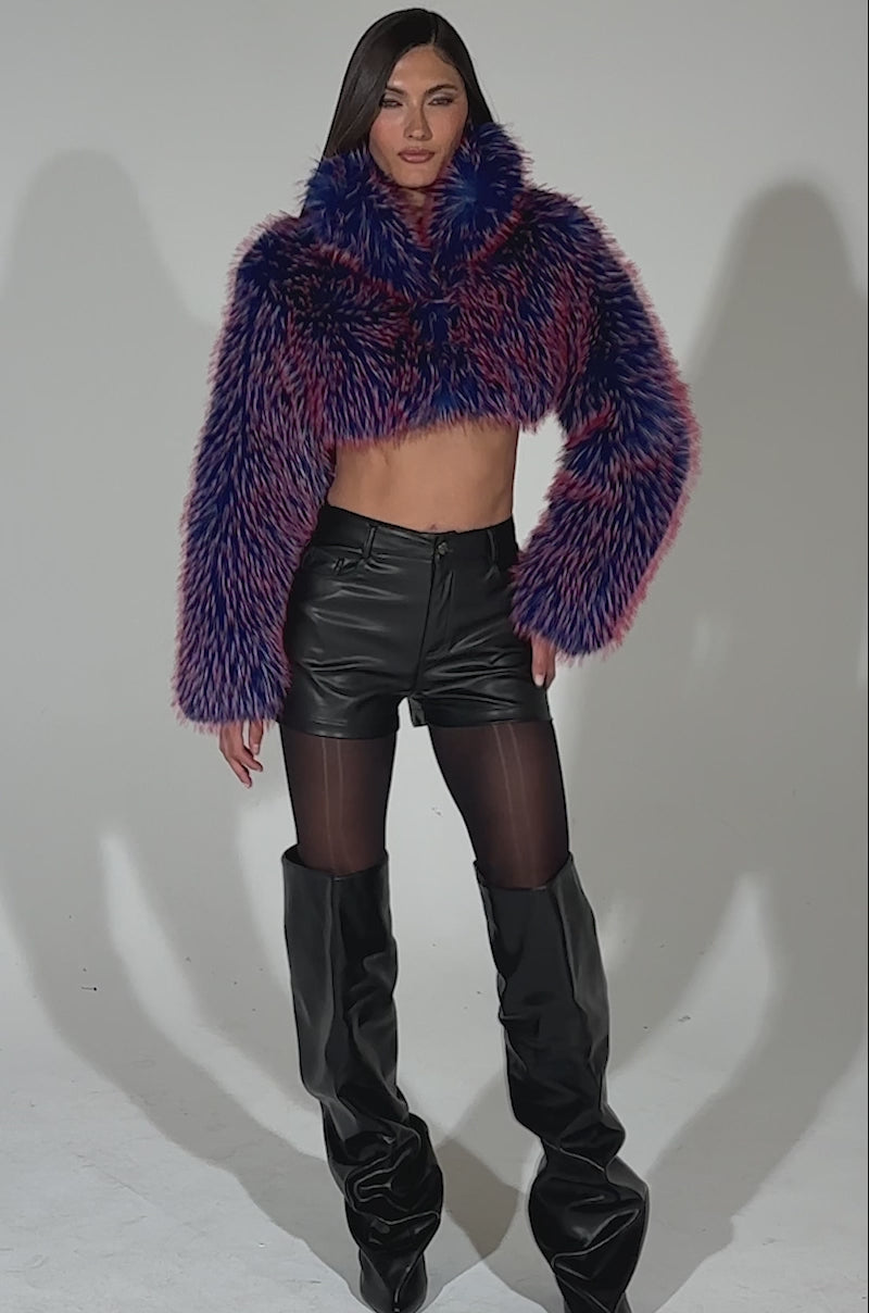 The AKIRA Label Nellie Faux Fur Bolero is a bold layering piece that blends playful color with luxe texture. Designed in a cropped silhouette, this bolero features plush faux fur in striking shades of electric blue and hot pink with high-shine, multi-tonal fibers that create a dynamic, eye-catching finish. It’s complete with a structured collar, long sleeves, silky-smooth satin lining, and a discreet hook-and-eye front closure.