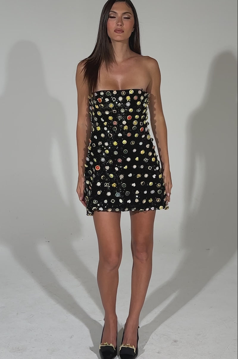 …Is it casual now? The AKIRA Label Never Nonchalant Button Mini Dress will have you doing the absolute most. Crafted from a sleek, stretchy base fabrication, this slinky stunner is covered with layers of shimmering black sequins and adorned with a colorful assortment of unique, vintage-inspired buttons, cabochons, and eclectic pins. Complete with a curve-hugging fit, smooth inner lining, and a back zipper closure, this party-perfect piece pairs perfectly with a pair of colored tights, pumps, and a bold red lip.