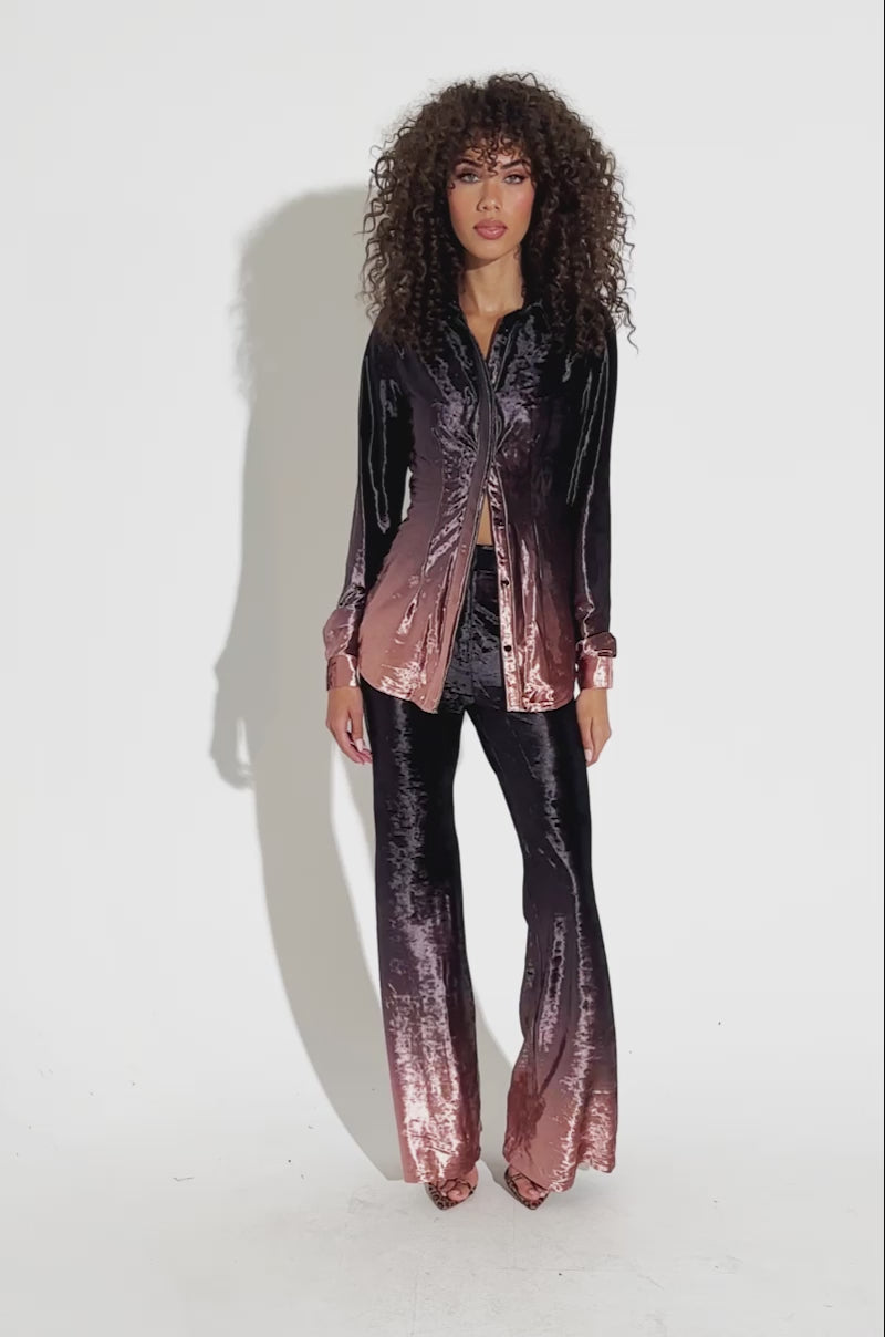 Looking for a new go-to this season? The AKIRA Label Never Switch Up Ombre Button Down Blouse In Black won’t fail you! This classy top is crafted from a semi-stretchy, sumptuous crushed velvet fabrication and features a pointed collar, long sleeves with button cuffs, a chic ombre colorway on the bottom hem and arms, and button down front closures. Complete with a fitted, longline silhouette. Pair with the coordinating AKIRA Label Never Switch Up Ombre Flare Leg Pant, stilettos, and a red lip for a holiday-ready ensemble.