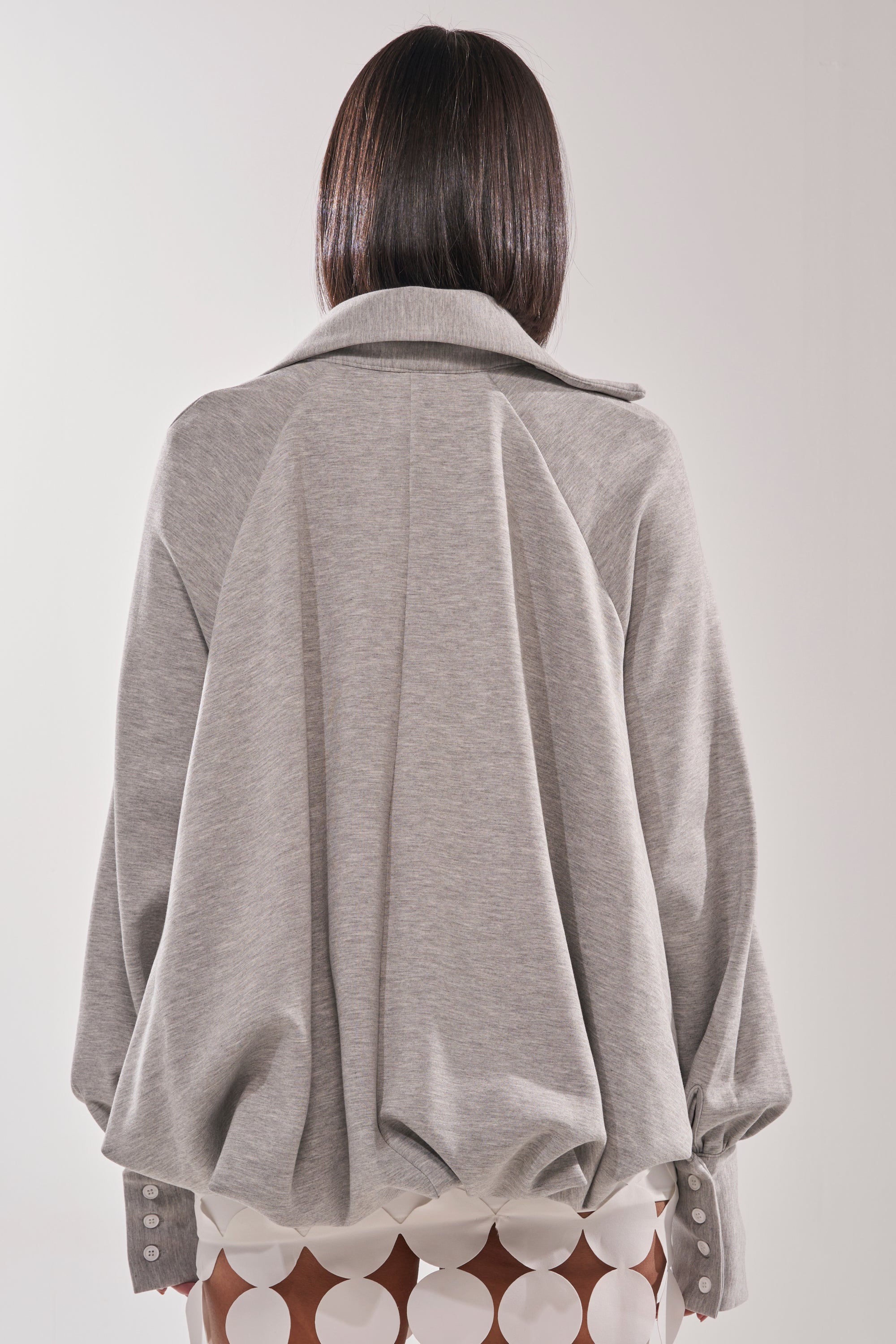 The AKIRA Label New Rules High Low Blouse in Grey is crafted from a super soft and stretchy knit fabrication and features an oversized fit, a V-neckline with a pointed fold-over collar, long button-cuff sleeves, and an asymmetrical high-low bubble hem. Style with jeans, a trench coat, and boots for an easy everyday look.