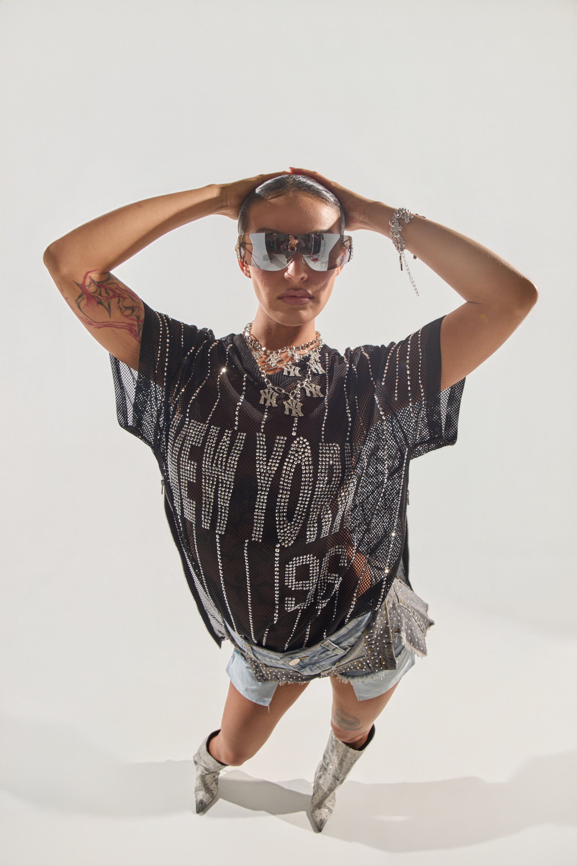 Oversized bedazzled mesh “New York” jersey, delivering major city-girl energy. Made from sheer, breathable mesh and featuring a sporty V-neckline, relaxed short sleeves, and shimmering rhinestone stripe detailing throughout. Complete with the rhinestone-embellished phrase “New York” across the chest for a standout finish. Wear it as a mini dress with biker boots, or throw it over baggy denim for an off-duty, downtown vibe.